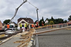 Nový most na silnici I/19 v Počaplech na Příbramsku již získal svůj tvar. K vybetonované hlavní nosné konstrukci přibyla římsa, která se betonovala koncem loňského týdne (viz. obrázky). Most díky ní bude širší než původní a bezpečnější pro chodce. Užší římsa bude vybetonována i na druhé straně mostu. Postupně se začne odstraňovat bednění skruže a její železná nosná konstrukce, aby se uvolnil prostor pod mostem a mohly pokračovat dokončovací práce na dolní stavbě a úpravě koryta. Na horní stavbě bude provedena izolace hlavní nosné konstrukce včetně pokládky litého asfaltu. Za oběma mostními opěrami ještě proběhne betonáž drenážním betonem a postupně se práce přesunou také na přechodovou oblast mostu.