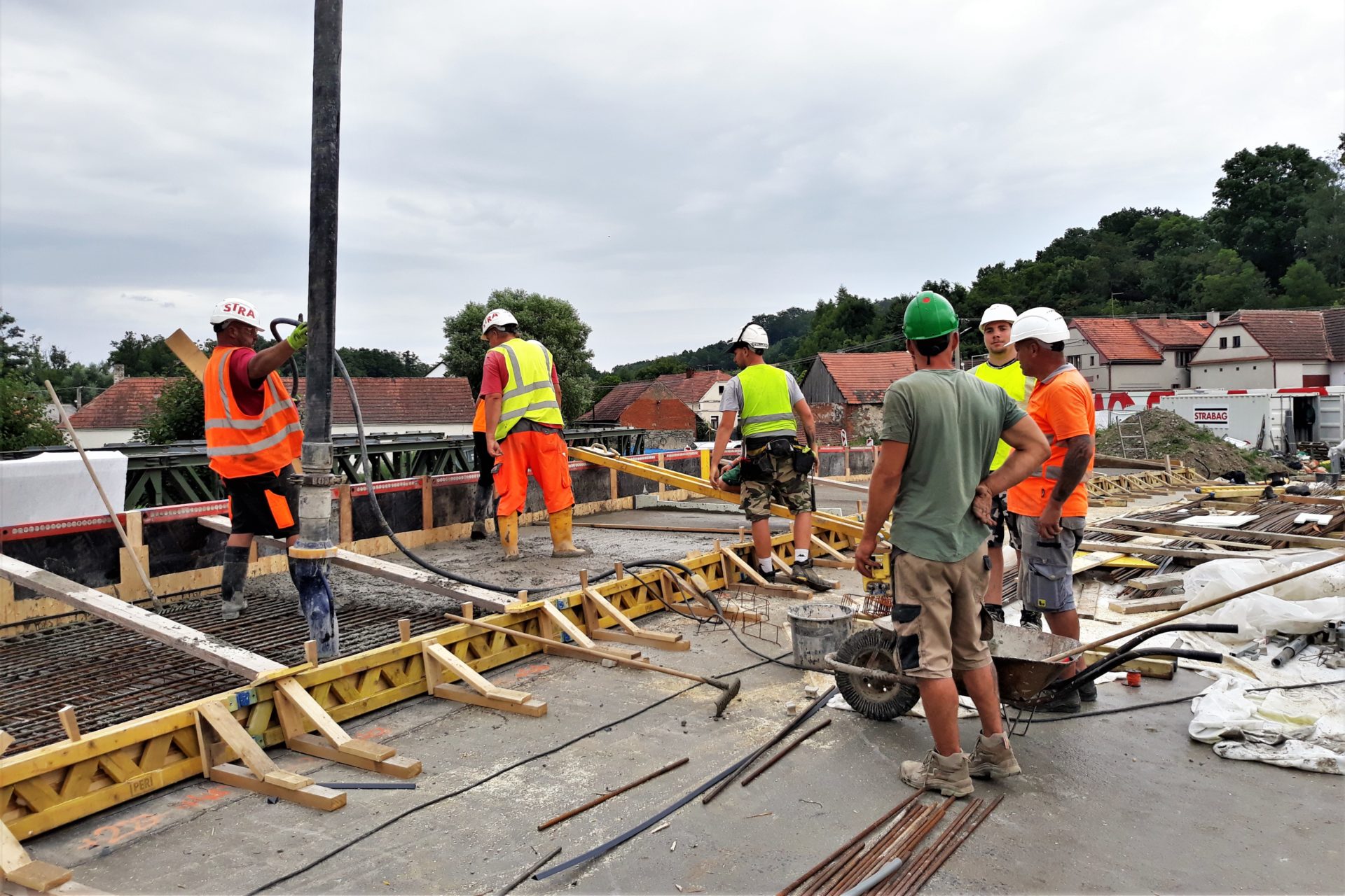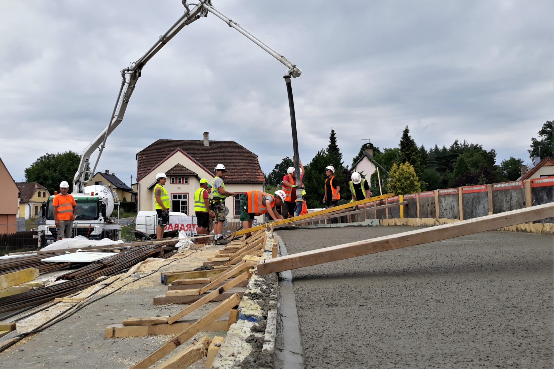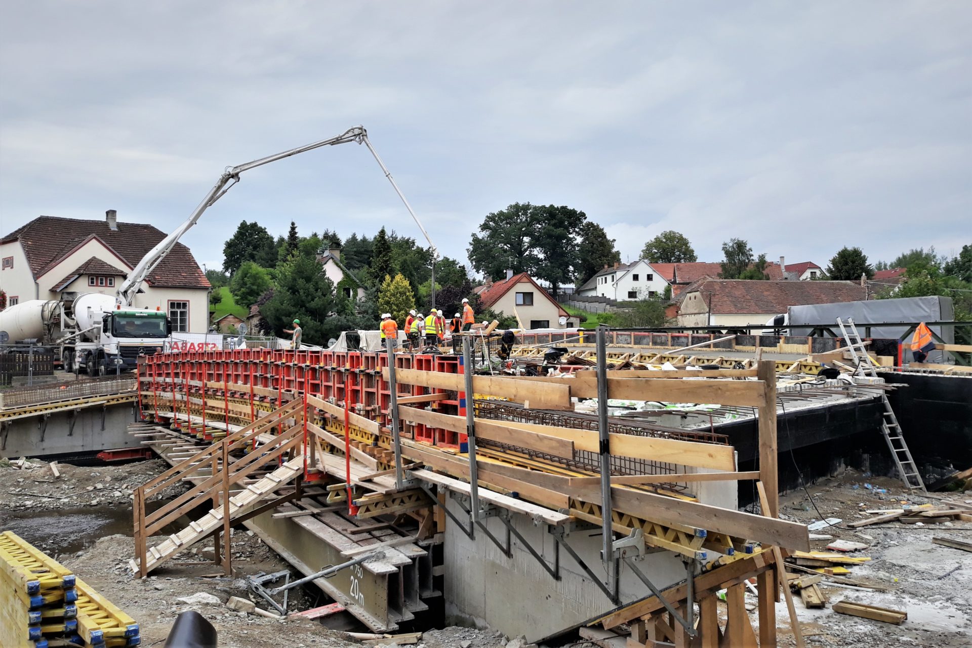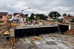 Nový most na silnici I/19 v Počaplech na Příbramsku již získal svůj tvar. K vybetonované hlavní nosné konstrukci přibyla římsa, která se betonovala koncem loňského týdne (viz. obrázky). Most díky ní bude širší než původní a bezpečnější pro chodce. Užší římsa bude vybetonována i na druhé straně mostu. Postupně se začne odstraňovat bednění skruže a její železná nosná konstrukce, aby se uvolnil prostor pod mostem a mohly pokračovat dokončovací práce na dolní stavbě a úpravě koryta. Na horní stavbě bude provedena izolace hlavní nosné konstrukce včetně pokládky litého asfaltu. Za oběma mostními opěrami ještě proběhne betonáž drenážním betonem a postupně se práce přesunou také na přechodovou oblast mostu.