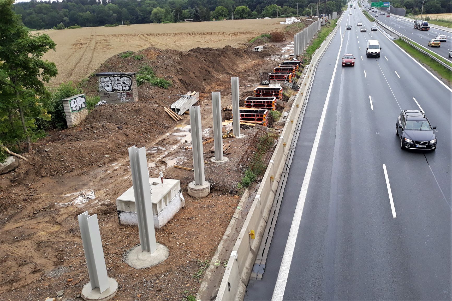 Další 2 protihlukové stěny se dokončují na dálnici D1. Podél nájezdové větve MÚK Chodov směr centrum doplňujeme cca. 100 metrů mezi dvě již vybudované části. Vztyčeny jsou sloupy a připravuje se samotné osazení soklových a absorpčních desek. U Újezdu u Průhonic se dokončuje pilotové založení pro sloupy PHS. V místech kde to nebylo možné z důvodu skalního podloží se přistoupilo k založení plošnému. Z důvodu zahájení zakládání sloupů u mostu přes Botič došlo o tomto víkendu také k omezení na dálnici D1 a provoz je v inkriminovaném úseku veden 3 provizorními jízdními pruhy. V sobotu 21.8. 2021 je pak plánované krátkodobé uzavření dálnice D1 od Exit 6 Průhonice. Po cca. 15-20 minutách bude provoz obnoven ve 2 pruzích směr Praha, což by mělo trvat přibližně celé dopoledne, a poté bude obnoven provoz opět ve 3 pruzích. Důvodem tohoto plánovaného omezení je osazení ocelové mostní konstrukce na již vybudované opěry, která bude sloužit pro uchycení samotná protihlukové stěny.
