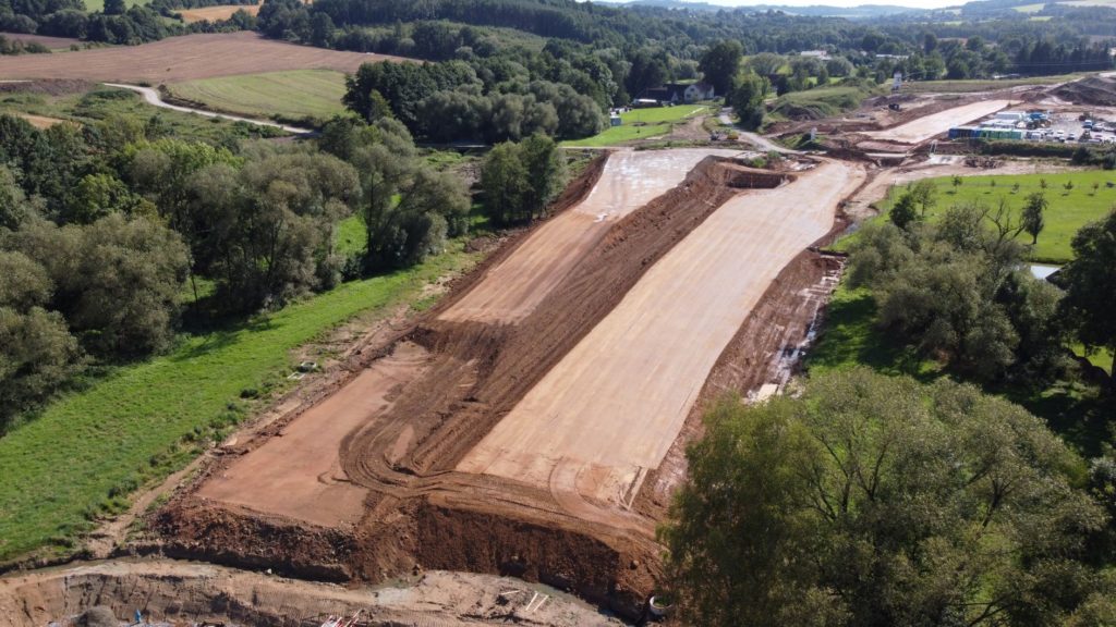 Pokračujeme také v dosypávání prvního násypu ve směru od Benešova km 0,8 – 1,24. V srpnu se nám podařilo v tomto úseku již dobetonovat rámový most (SO 203.1). V září jsme realizovali zajištění jeho odvodnění v podobě mostních drenáží a izolaci spodní i stropní konstrukce. V návaznosti na dosypávání násypu bude proveden jeho zásyp a dojde tak k propojení celého násypu ve směru staničení. Souběžně pokračovala těžba zářezu v km 1,2-1,8 na úroveň pláně. V srpnu jsme rovněž úspěšně dokončili sanování podloží rámového mostu v km 1,8 a v průběhu září jsme tak mohli začít s jeho založením. Probíhalo vázání jeho výztuže, provedeno bylo bednění. Probíhá nebo bude provedena betonáž základů, opěr a stropní konstrukce. I na rámovém mostě v km 2,2 probíhaly vazačské práce jeho jednotlivých částí a následné betonování.