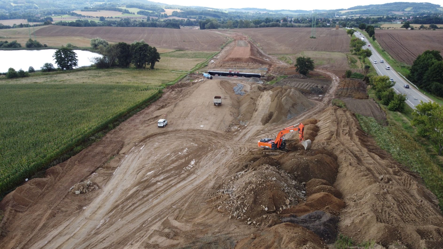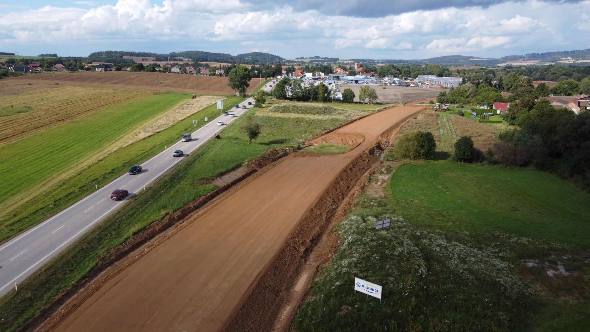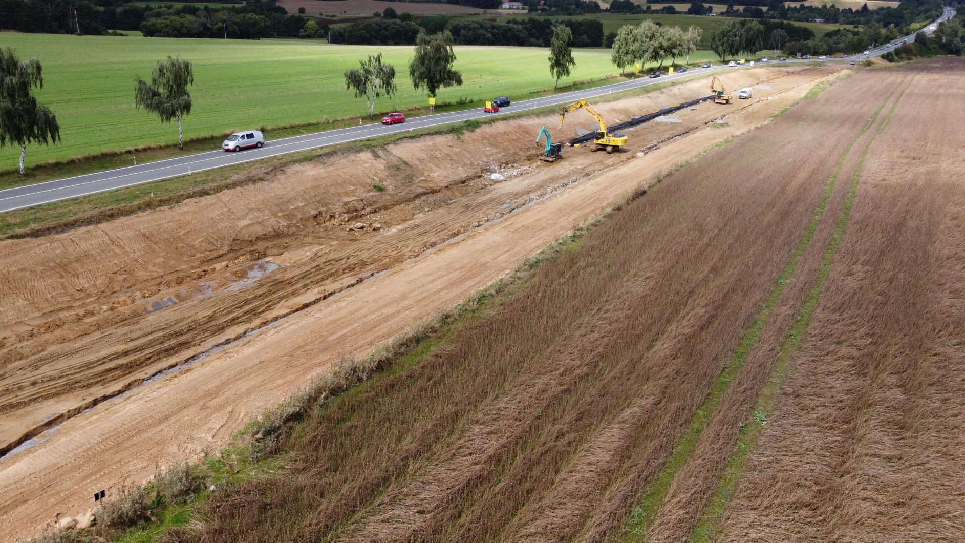 Výstavba obchvatu Olbramovic na sil. I/3 probíhá zatím podle plánu. Pracuje se na objektech pozemních komunikací, mostech i vodohospodářských objektech. Zřetelné jsou již budované zářezy i násypy budoucí komunikace. Ze zásadních činností, které v záři probíhaly, je třeba zmínit realizaci trativodního potrubí v zářezu na začátku obchvatu, dle staničení od Benešova. Po dokončení založení potrubí bude řešena výměna aktivní zóny. Obdobně probíhá realizace v km 1,8-2,4. V místě budoucí mimoúrovňové křižovatky, kde se nacházíme pod hladinou podzemní vody, jsme provedli k prohloubení drenáží a zvětšení jmenovitého vnitřního průměru potrubí. Následovat bude výměna celé aktivní zóny.