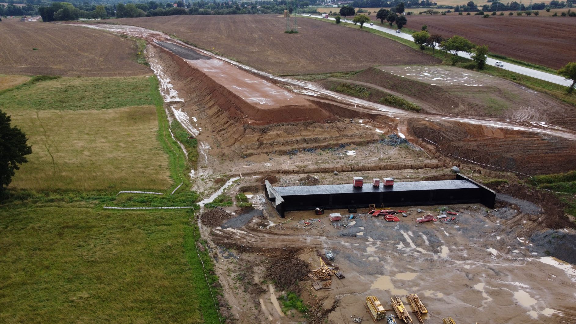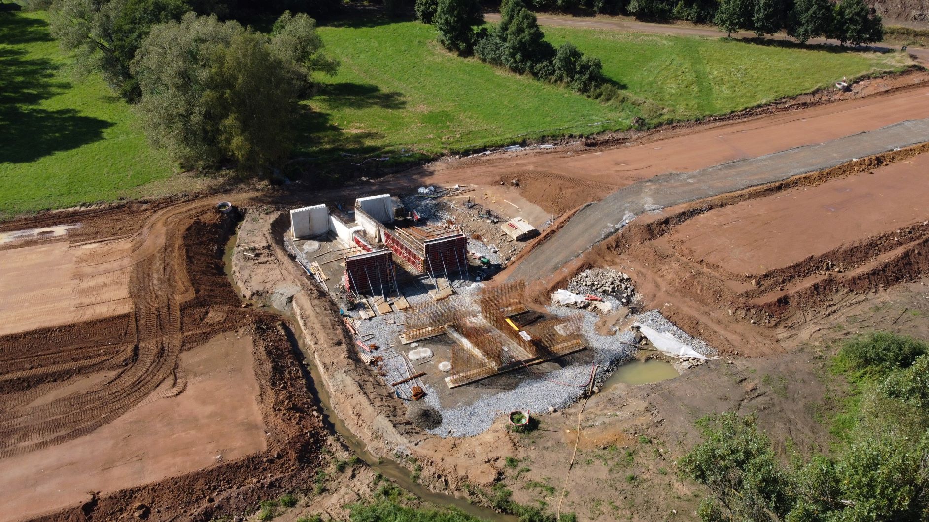 Pokračujeme také v dosypávání prvního násypu ve směru od Benešova km 0,8 – 1,24. V srpnu se nám podařilo v tomto úseku již dobetonovat rámový most (SO 203.1). V září jsme realizovali zajištění jeho odvodnění v podobě mostních drenáží a izolaci spodní i stropní konstrukce. V návaznosti na dosypávání násypu bude proveden jeho zásyp a dojde tak k propojení celého násypu ve směru staničení. Souběžně pokračovala těžba zářezu v km 1,2-1,8 na úroveň pláně. V srpnu jsme rovněž úspěšně dokončili sanování podloží rámového mostu v km 1,8 a v průběhu září jsme tak mohli začít s jeho založením. Probíhalo vázání jeho výztuže, provedeno bylo bednění. Probíhá nebo bude provedena betonáž základů, opěr a stropní konstrukce. I na rámovém mostě v km 2,2 probíhaly vazačské práce jeho jednotlivých částí a následné betonování.