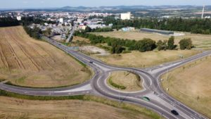 Čtyřramenná spirálovitá okružní křižovatka, u níž náklady na výstavbu přesáhly 60 mil. Kč bez DPH, byla uvedena do provozu v roce 2019 a nahradila v daném místě již nevyhovující křižovatku stykovou. Je jednou ze staveb na sil. I/3 navazujících na plánované zkapacitnění 2+1 této komunikace podél Benešova.