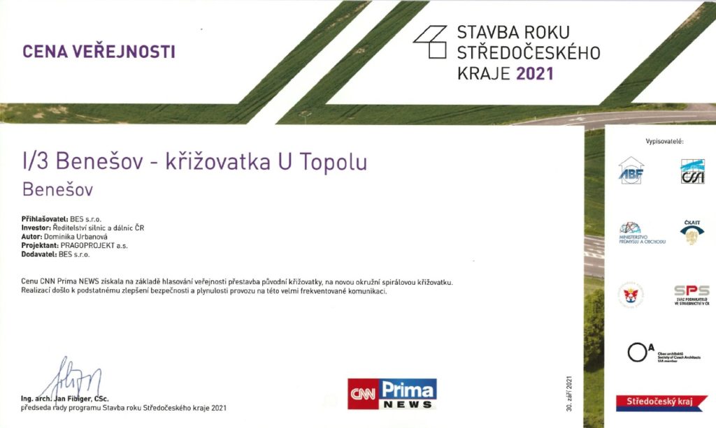 30. září proběhlo v Kutné Hoře slavnostní vyhlášení soutěže Stavba roku Středočeského kraje 2021 a svoji cenu si odneslo i Ředitelství silnic a dálnic s. p.. Moderní okružní křižovatka U Topolu na silnici I/3 na Benešovsku získala Cenu veřejnosti. Z 29 496 hlasů bylo 9279 právě pro tuto stavbu.