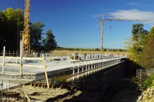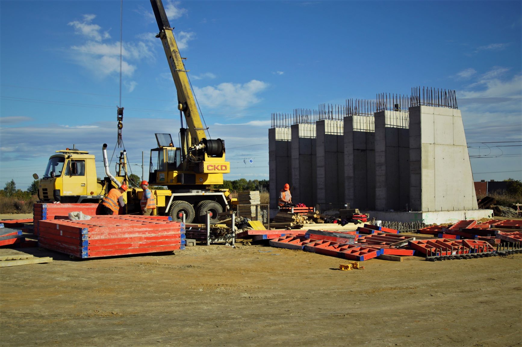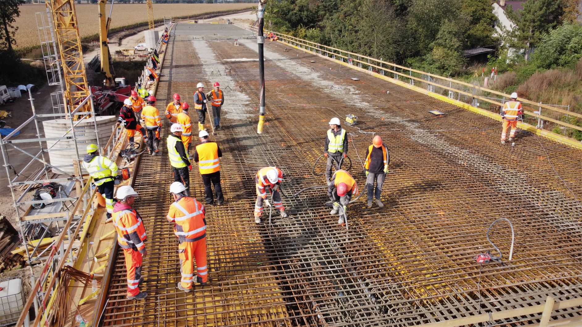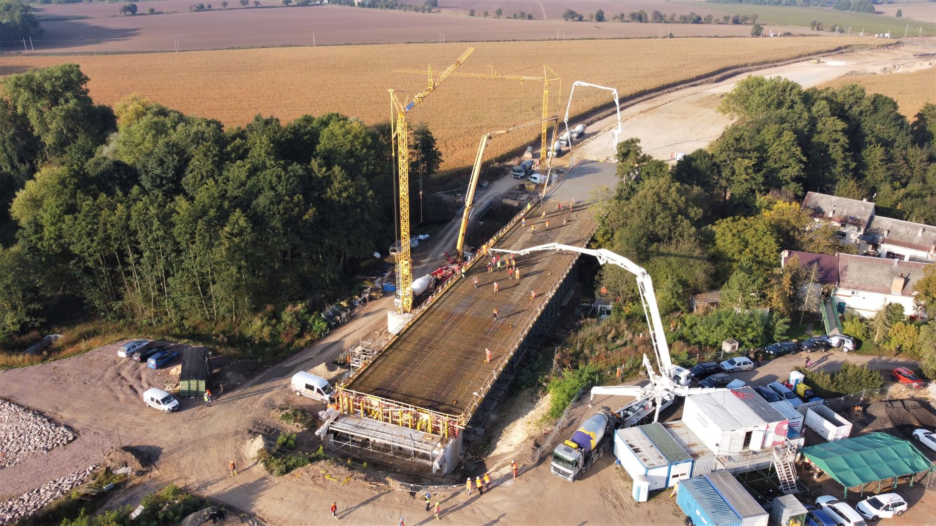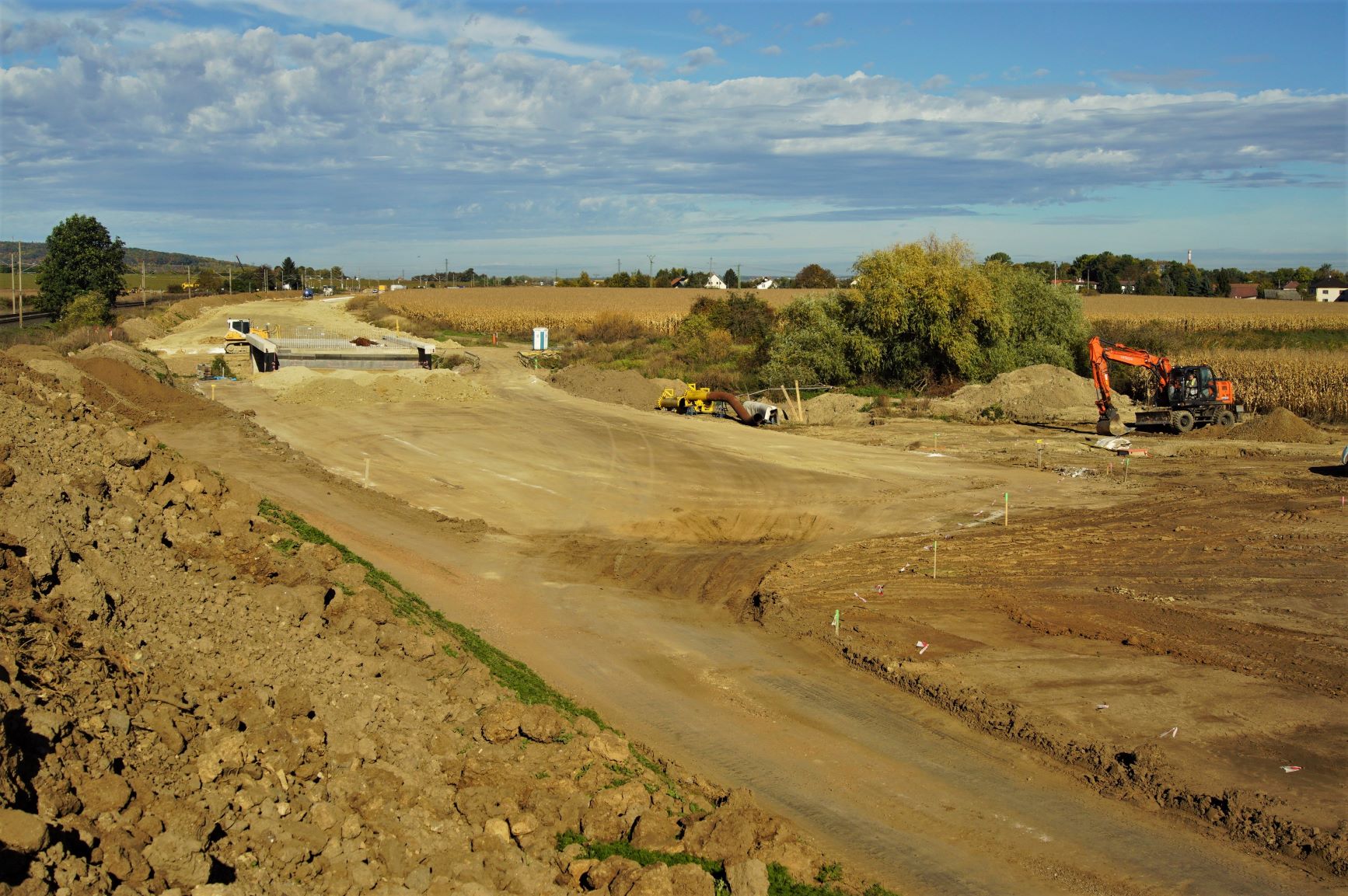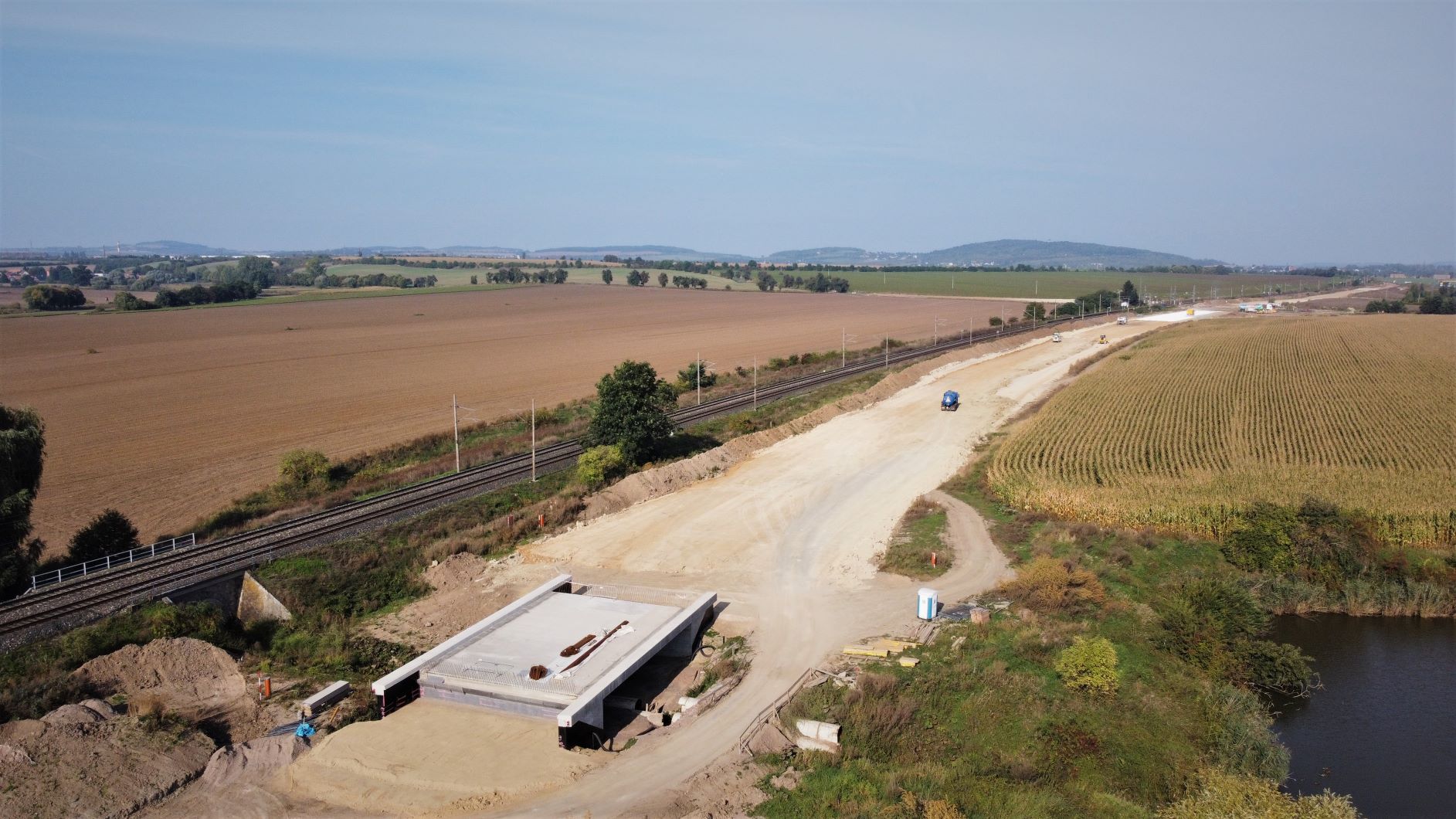 Pracuje se rovněž na posledním mostě, který bude překlenovat železniční trať a jako součást mimoúrovňové křižovatky i budoucí přeložku silnice I/38. Tady probíhají práce na betonáži 2 mostních opěr a 3 pilířů. Hlavní nosná konstrukce mostu na ně bude usazena pomocí vysokotonážního jeřábu předběžně v 1. polovině roku 2022, v závislosti na termínu výluky provozu na železniční trati.