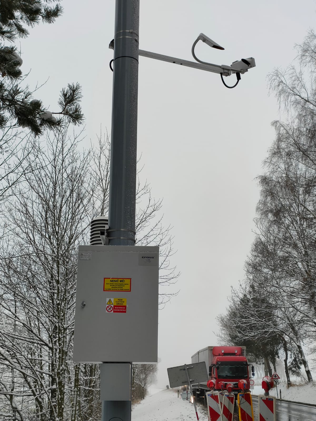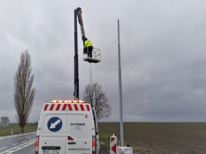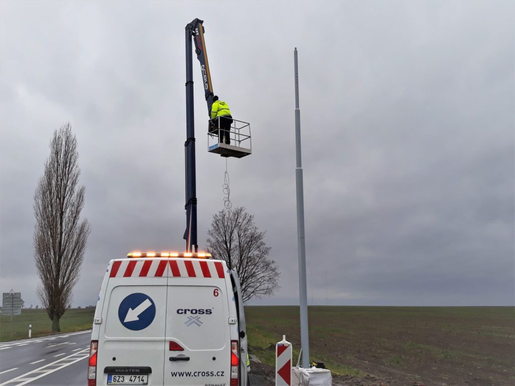 V tomto týdnu dokončujeme na všech místech osazení čidel a kamer na již postavených nosných stožárech. Do obrusné vrstvy vozovky jsou rovněž osazována vozovková čidla, která poskytují informace např. o teplotě povrchu vozovky, bodu mrznutí, stavu vozovky suchá, vlhká, mokrá, zbytková sůl, sníh, námraza) nebo výšce vodního filmu. Mimo vozovkového čidla nalezneme na stožárech