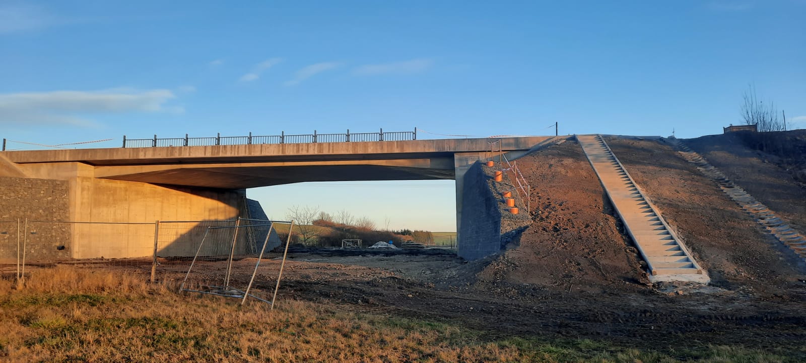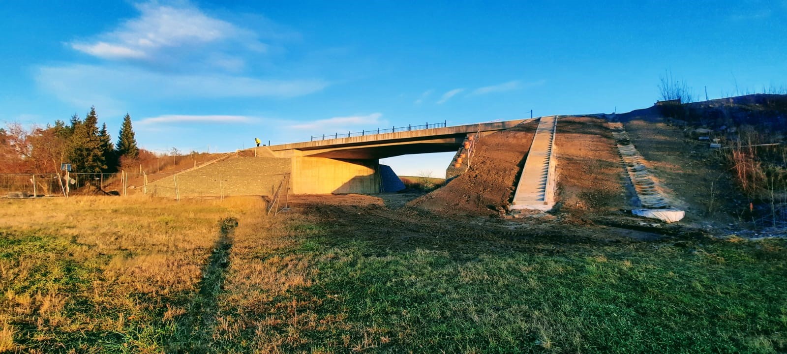 V úterý 7.12. 2021 již na mostě a obou jeho předmostí proběhla pokládka obrusné vrstvy asfaltového souvrství, což značí, že se blížíme do finální fáze před uvedením mostu do provozu. Na římsách zbývá ještě dokončit osazení zábradelních svodidel ve stupni zadržení H2 a výšky 1,1 metru. Z obou stran mostu (předmostích) budou osazena rovněž svodidla. Část terénních úprav v okolí mostu je již provedena v podobě osazení revizních schodišť a skluzů odvodnění. Další úpravy jako je vyčištění silnic III. třídy a úprava ploch pod mostem pohozem ze štěrkodrti ještě budou probíhat. Zbývající dokončovací práce společně s opravou objízdné trasy provedeme na jaře 2022. Pro řidiče uvedeme most do provozu nejpozději v týdnu před Štědrým dnem.