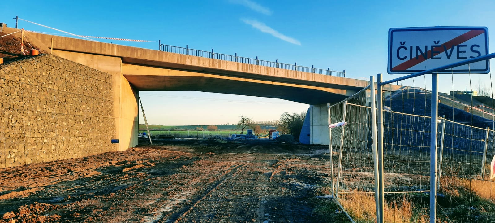 Koncem června tohoto roku jsme zahájili komplexní opravu mostu ev.č. 32-002a, který převáděl v délce 43 metrů silnici I/32 přes silnici III/3248 u Činěvsi na Nymbursku. Oprava za necelých 30 mil. Kč bez DPH spočívala v demolici již nevyhovujícího třípólového mostu z prefabrikovaných předpjatých nosníků a ve výstavbě nového, který se konstrukčně liší od svého předchůdce. Z původního mostu byly v podstatě ponechány pouze základy a na nich vyrostl jednopólový most rámové konstrukce s nosnou konstrukcí z monolitického předpjatého betonu. Tím, že je konstrukce rámová, odpadá nutnost instalace ložisek a není třeba ani mostních závěr, čímž se snižují náklady na následnou údržbu. Spodní stavba je ze železového betonu a hlubině založená na 14 kusech velkoprůměrových pilotách, po sedmi pro každou z opěr mostu. Aktuální délka přemostění je 21,7 metrů a zkrátila se i délka nosné konstrukce ze 46,14 na 24,277 metrů a tedy i délka mostu z 50 na 31,7 metů.