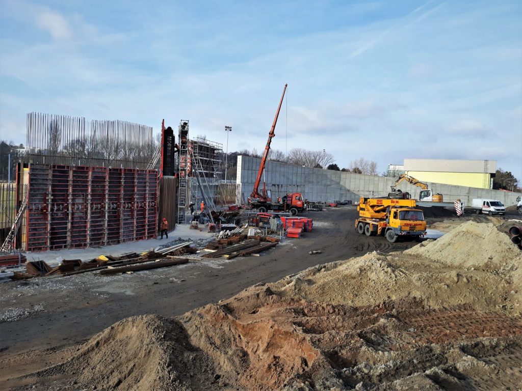 Ta řeší minimalizaci záboru sportovního areálu a bude opírat násyp silničního tělesa, které napojí komunikaci z mostu. Jedná se o železobetonovou monolitickou zeď s proměnnou výškou, která v nejnižším bodě dosahuje výšky 2,4 metrů a v tom nejvyšším až 11,4 metrů. Délka zdi je téměř 274 metrů. Její založení je plošné, se základy šířky 4-7,3 metrů v závislosti na její výšce v daném místě. Ve čtvrtek 27.1. 2022 probíhala stavba bednění v nejvyšším 11,4 metrů vysokém úseku, aby v pátek mohla proběhnou betonáž. Jelikož stavba zdi probíhá po částech tzv. dilatačních úsecích délky 18,2 až 40 metrů, v doposud nevybetonovaných úsecích se současně pracuje na armování a přípravě betonáže. Na výstavbu opěrné zdi v celé její délce a výšce bude třeba 3 700 m3 betonu a 360 tun armatury.