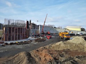 Mimo pokračujících přeložek sítí se i nadále pokračuje ve výstavbě opěrné zdi komunikace.