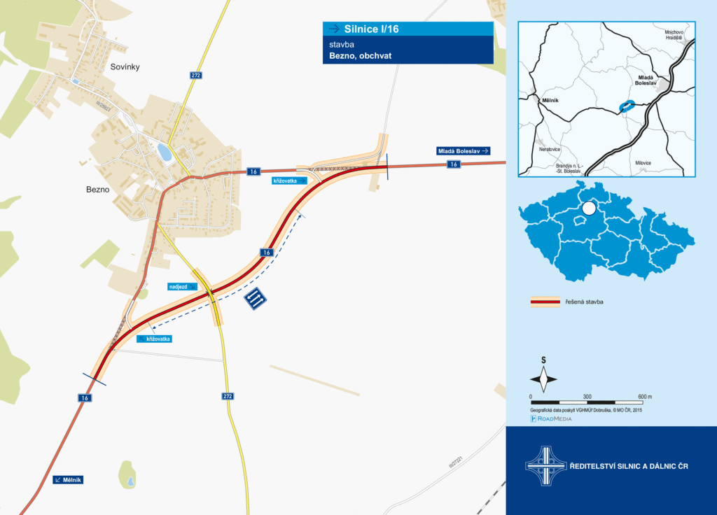 Odbor územního plánování a stavebního řádu, Krajského úřadu Středočeského kraje zahájil začátkem února územní řízení ve věci umístění stavby „I/16 Bezno, obchvat“. Obchvat obec Bezno (okr. Mladá Boleslav) se řadí mezi soubor staveb, které přispějí ke zvýšení bezpečnosti a plynulosti provozu na silnici I/16 mezi Mělníkem a dálnicí D10. Průjezd obcí v současnosti představuje dopravní závadu, kterou stavba plánované přeložky odstraní a vyvede provoz mimo zastavěné území. Účelem stavby je tak především odvést tranzitní dopravu, která je v současnosti vedena přes obec, mimo stávající zástavbu a výrazně zklidnit její centrální část, kudy podle posledního sčítání dopravy projede cca 6000 vozidel za den.