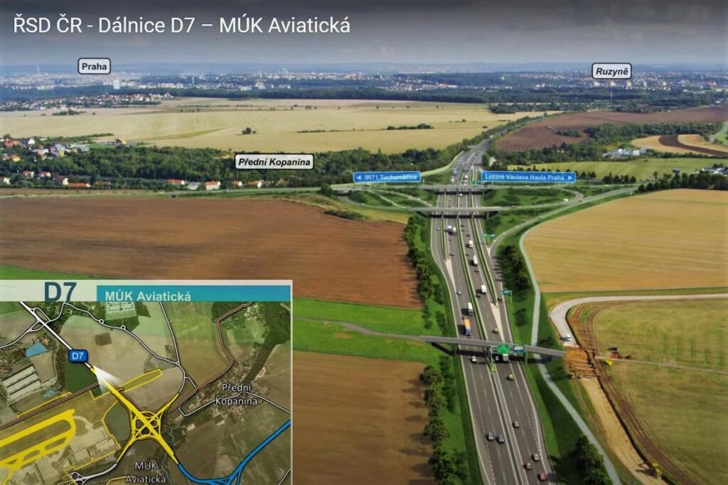 Ministerstvo dopravy ČR zahájilo stavební řízení k povolení stavby „D7 MÚK Aviatická“ v rozsahu několika stavebních objektů, z kterých lze uvést SO 101 – hl. trasa rozšíření D7 v celkové délce úpravy 1080 metrů, SO 110 řešící mimoúrovňovou křižovatku budoucí dálnice D7 a ulice Aviatická, kde je křižovatka tvořena osmi větvemi a dvěma kolektorovými pásy, které propojují všechny směry (centrum, Slaný, letiště Praha Ruzyně, Přední Kopanina). Celková délka větví bude vice než 4000 metrů. Součástí jsou rovněž stavební objekty v podobě 3 mostů (SO 201-203), opěrných zdí větví křižovatky v délce 267 metrů nebo protihlukové stěny v celkové délce 372 metrů.