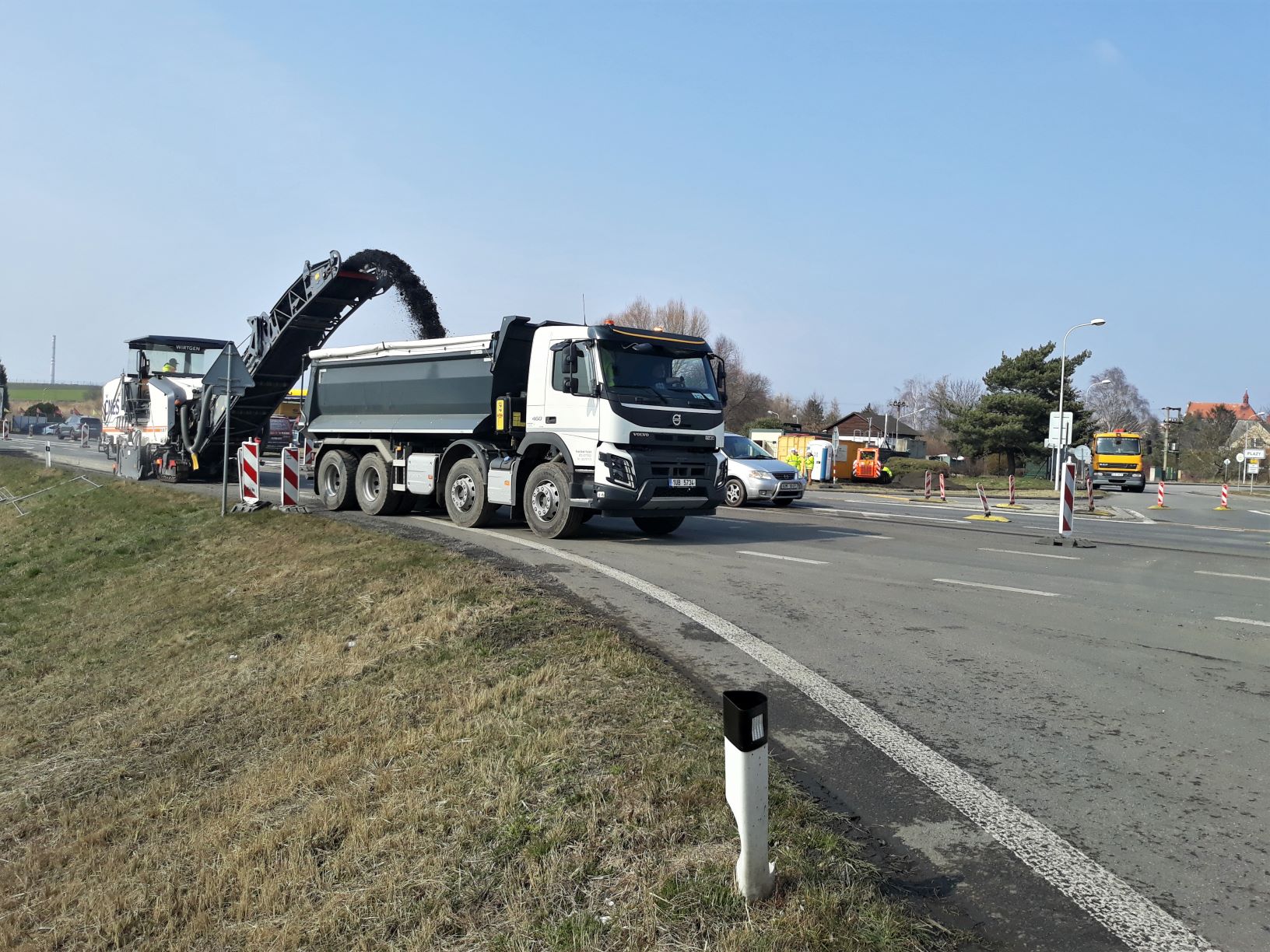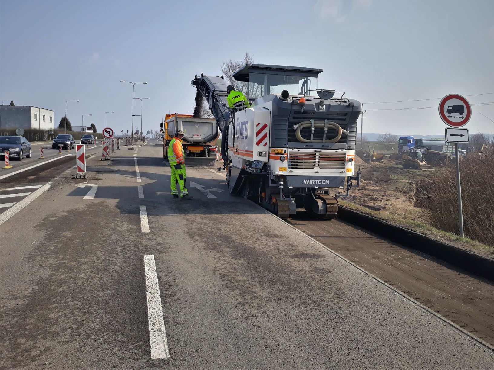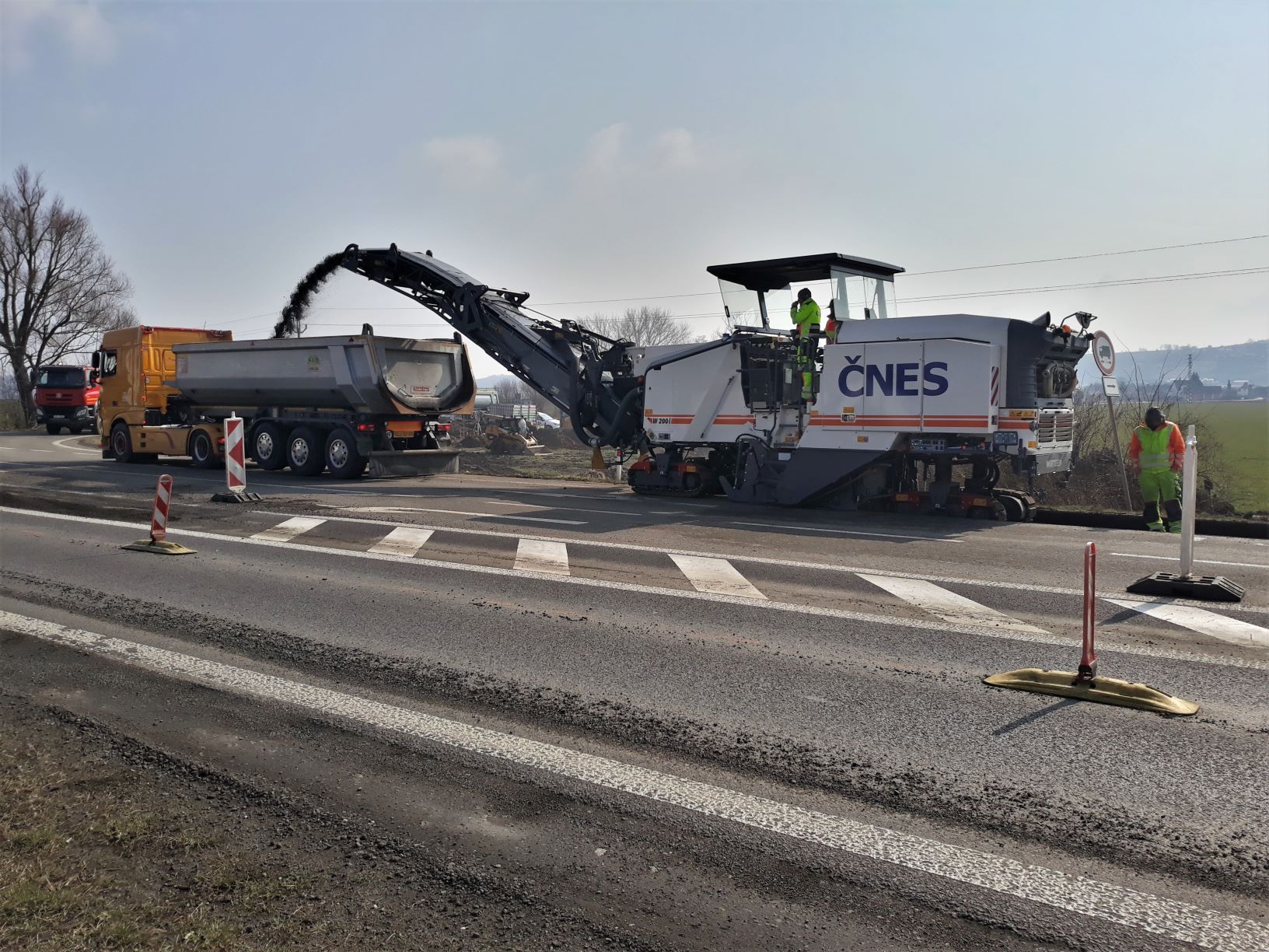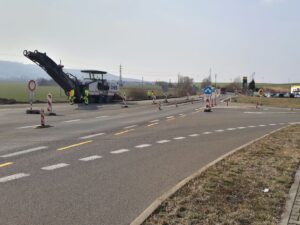 Úpravu jsme zahájili frézováním starých konstrukčních vrstev části vozovky I/16 a silnice III/27515 na Kolomuty, přeložkou vodovodu a sdělovacích kabelů CETIN a dalšími zemními pracemi. Místem stavby je veden provoz v režimu 1+1 provizorní jízdní pruh. S přechodem na další etapu, cca v polovině května 2022, bude provedena také přestavba dopravně inženýrského opatření. 1 jízdní pruh bude uzavřen a provoz v pojížděném jízdním pruhu bude řízen kyvadlově.