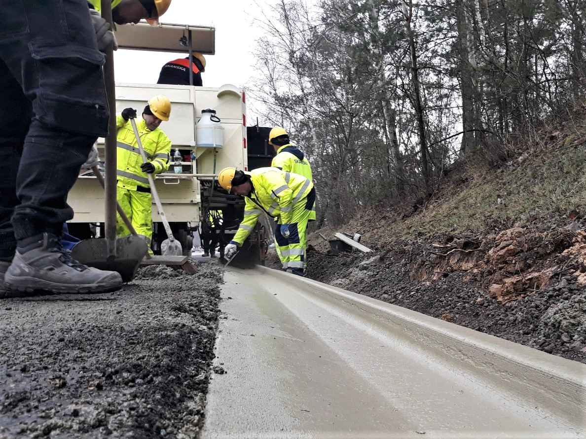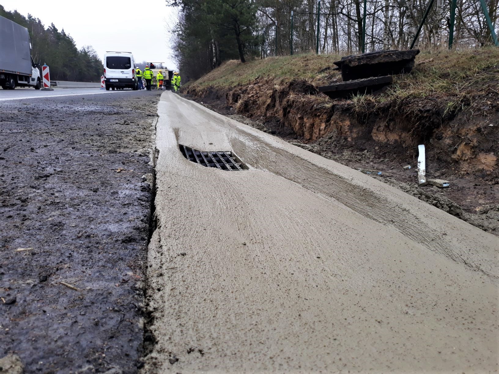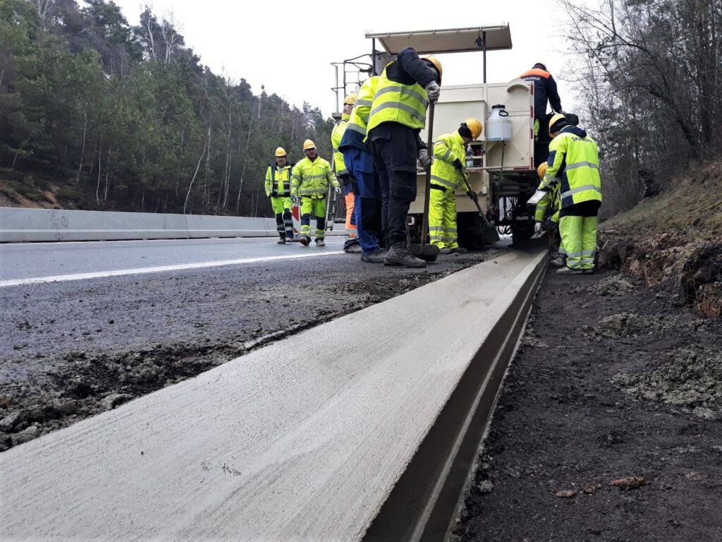 Dnes v 08:45 hod. byla zahájena pokládka nového rigolu odvodnění z monolitického betonu v provedení Carb King, které se provádí speciálním betonovým finišerem, a to pomocí forem s kluznými bočnicemi. Celkem 750 metrů nového rigolu při krajnici levého jízdního pásu bychom rádi položili ještě v průběhu dnešního dne. Nicméně před zahájením této technologie bylo třeba starý rigol odstranit, opravit uliční vpusti a sanovat podloží, aby bylo přesně připraveno na pokládku.
