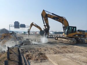 O tomto víkendu pokračujeme v demolici jižní poloviny východní části mostu přes Chlumeckou ulici na dálnici D0. Práce tak zasáhnou i Chlumeckou ulici v Praze 20 a to v jejím jízdním pásu ve směru z centra na Horní Počernice. Samotná demolice bude zahájena v sobotu 2.4.2022 ráno, nicméně před tím je třeba pod most navézt a rozprostřít štěrkové lože, které bude chránit povrch vozovky.