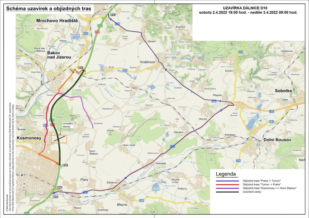 Dále upozorňujeme, že Škoda Auto a.s. jako investor bude v průběhu roku realizovat stavbu nového nadjezdu nad dálnicí D10 cca v km 46,1 nedaleko MÚK EXIT 46 Kosmonosy, který bude součástí jím budované nové infrastruktury pro nákladní dopravu do závodu V průběhu soboty 2.4.2022 a neděle 3.4. 2022 nejdéle do 13:00 hod proběhne v souvislosti s touto stavbou výstavba dopravně inženýrského opatření. Aby mohl být postaven pilíř mostu ve středovém dělícím pásu dálnice bude v inkriminovaném místě uzavřen v obou směrech levý jízdní pruh. Doprava na Prahu i Turnov bude v obou směrech vedena 2 provizorními jízdními pruhy šířky 2,75 a 3,5 metrů. S tímto omezením musí řidiči počítat přibližně do 2. poloviny června 2022.