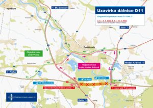 Z důvodu diagnostického průzkumu a provedení zatěžovacích zkoušek mostu ev.č. D11-040..3, lanový most přes Labe, bude obousměrně uzavřena dálnice D11 mezi MÚK 42 Libice a MÚK 39 Kluky v následujících plánovaných termínech: