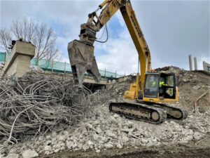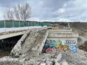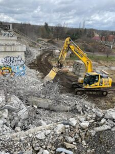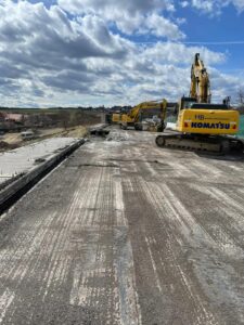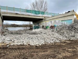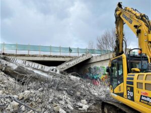 V pondělí 4.4.2022 jsme na dálnici D4 zahájili stavbou dopravně inženýrského opatření komplexní opravu dálničního mostu ev.č. 4-020..1 a 4-020..2 v km 28,915, který u obce Stará Huť překlenuje přepad Huťského rybníka, a to na polovině mostu v jízdním pásu dálnice směrem na Prahu. Po demontáži příslušenství mostu (zábradlí, svodidla, protihluková stěna) a vyfrézování vozovkového souvrství jsme již o víkendu 9.-10.4.2022 zahájili demolici starého mostu. Za použití těžké techniky jsme snesli hlavní nosnou konstrukci a pokračovat budeme dolní stavbou za současné deponie a odvozu sutě.