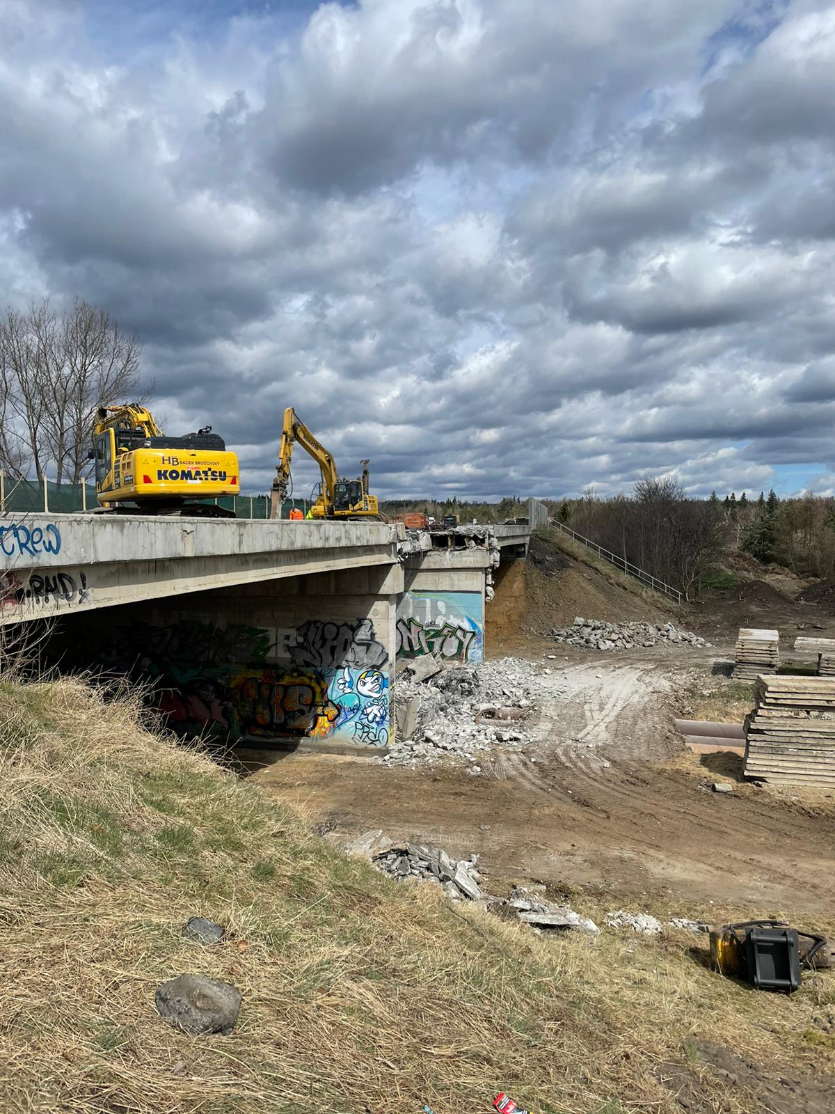 V pondělí 4.4.2022 jsme na dálnici D4 zahájili stavbou dopravně inženýrského opatření komplexní opravu dálničního mostu ev.č. 4-020..1 a 4-020..2 v km 28,915, který u obce Stará Huť překlenuje přepad Huťského rybníka, a to na polovině mostu v jízdním pásu dálnice směrem na Prahu. Po demontáži příslušenství mostu (zábradlí, svodidla, protihluková stěna) a vyfrézování vozovkového souvrství jsme již o víkendu 9.-10.4.2022 zahájili demolici starého mostu. Za použití těžké techniky jsme snesli hlavní nosnou konstrukci a pokračovat budeme dolní stavbou za současné deponie a odvozu sutě.