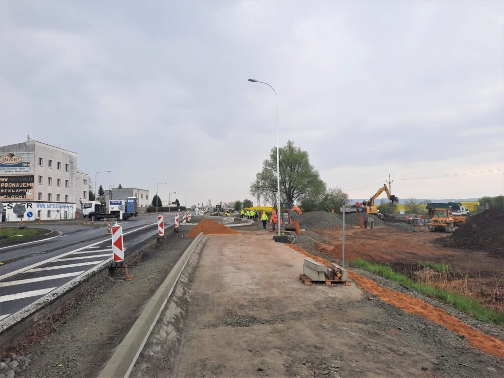 odkloněná část silnice III/27515 od Kolomut. Na této části nové křižovatky se dokončuje pokládka asfaltových konstrukčních vrstev vozovky, abychom sem v průběhu středy 11.5.2022 mohli převést provoz na silnici I/16 a zahájit výstavbu druhé, severní poloviny. Řidiči tak od středy musí počítat s omezením provozu a vedením dopravy pouze 1 jízdním pruhem s jejím kyvadlovým řízením světelnou signalizací. Tento způsob vedení dopravy stavbou zde vydrží až do 1. poloviny července.