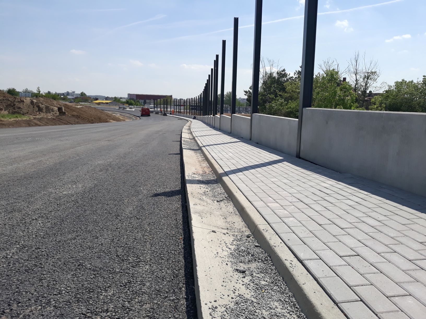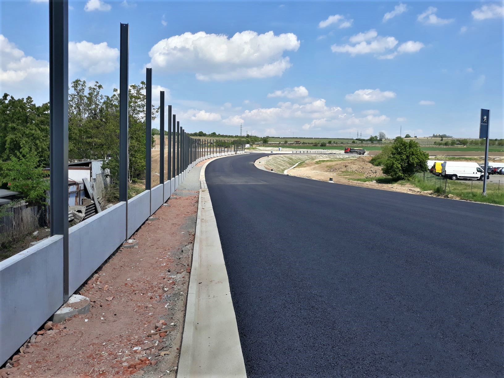 Na stavbě 2. části obchvatu Mělníka jsme zbourali část původní protihlukové stěny (PHS) podél silnice I/9 chránicí obytnou zástavbu v ulici Na Průhoně a již zde stavíme stěnu novou podél nově přeložené části silnice I/9 i nově postavené okružní křižovatky na výjezdu na Liběchov. Z PHS jsou osazeny sokolové panely a podél ní na lícové straně pokládáme dlažbu. Část původní komunikace I/9 již byla odstraněna a v jejím místě probíhá rekultivace. Na okružní křižovatce, jejich větvích a hlavní trase až k jejímu současnému křížení s ulicí Nad Oborou je položena asfaltová ložná vrstva. U tohoto křížení betonujeme sloupky budoucí protihlukové stěny. Další PHS vyroste na náspu mimoúrovňové křižovatky, kde probíhá vrtání pilotového založení sloupků. V trase obchvatu budou 4 stěny chránící obytné části před nadměrnou emitací hluku z provozu na nové části obchvatu. V součtu dosáhnou celkové délky téměř 1000 metrů.