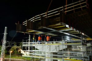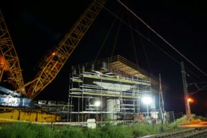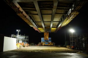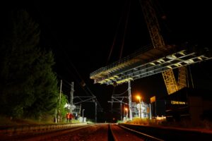 Z pátku 20.5.2022 na sobotu 21.5.2022 jsme v rámci několika hodinové provozní výluky na železniční trati Praha-Čáslav-H. Brod-Brno provedli osazení nosné konstrukce mostu, který bude mimoúrovňově převádět silnici III/03321 přes železnici a soudní hlavní trasu budovaného obchvatu. Celková délka mostu bude 129,5 metrů s celkovou délkou nosné konstrukce 118 metrů. Nosná konstrukce druhého pole mostu, které se osazovalo vysokotonážním jeřábem Liebherr LG1750, je dlouhá 38,9 metrů. Na místo instalace byla dopravena ve 2 dílech a po jejich montáži vážila 64t. Betonáží spřažené desky, osazením pochozí lávky pro následnou instalaci říms mostu a dalším vybavením byla její hmotnost před osazením 240t.Celá operace, která započala v pátek ve 23:30 byla ukončena před 02:00 druhého dne.