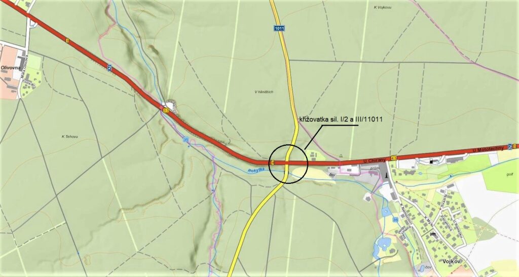 Čtyřramenná průsečná křižovatka silnic I/2 a III/1011 je místem se zvýšeným počtem dopravních nehod, jejichž důvodem je zejména srážka s jedoucím vozidlem. Křižovatka se nachází v lesním úseku mezi Říčany a Tehovem, okr. Praha-východ a je výrazným nehodovým místem na silnici I/2. Z tohoto důvodu bylo zadáno provedení místního dopravně-bezpečnostního šetření za účelem analýzy aktuální úrovně bezpečnosti a plynulosti silničního provozu. V případě lokalizace dopravně-bezpečnostních závad bude přistoupeno k návrhu nápravných opatření, jejichž cílem bude zajištění společensky přijatelné úrovně bezpečnosti a plynulosti provozu v místě sledovaného úrovňového křížení.