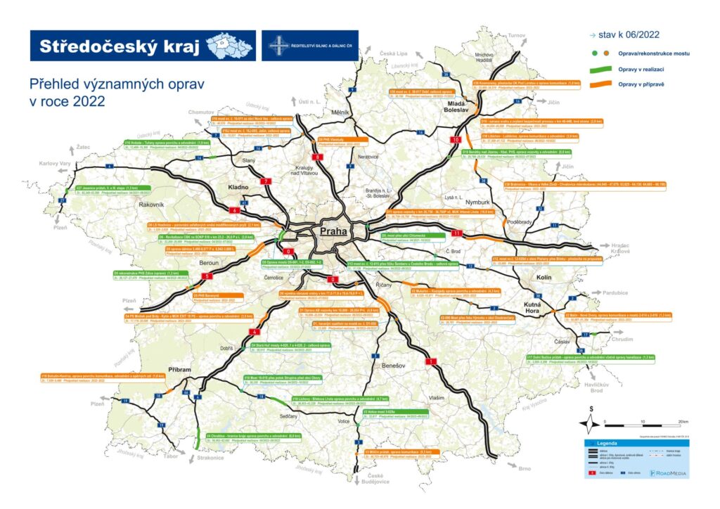 Nacházíme se v polovině letošní stavební sezóny a do provozu jsme již uvedli několik staveb. To na jednu stranu zlepšilo plynulost provozu a dopravní obslužnost v jednotlivých dotčených lokalitách, na stranu druhou nám to umožnilo zahajovat nebo připravovat další akce k zahájení ještě v letošním roce. Z oprav započatých v roce 2021 jsme dokončili opravu silnice I/9 v úseku Vehlovice-Želízy na Mělnicku, opravu EXIT 7 Buštěhrad na dálnici D7 a opravu mostu na sil. I/66 v Příbrami. Před uvedením do provozu jsou mosty na dálnici D5 u Chrášťan, aktuálně jejich části v levém jízdním pruh směrem do Prahy, kde s demontáží dopravního omezení počítáme v 1. polovině následujícího měsíce. V dalších jako, je oprava průtahu na sil. I/27 v Jesenici na Rakovnicku, oprava sil. I/4 Chraštice-hranice STC kraje, oprava sil. I/18 mezi Líchovy a Břekovou Lhotou na Příbramsku nebo celková rekonstrukce mostu přes Chlumeckou ulici na dálnici D0, i nadále pokračujeme.
