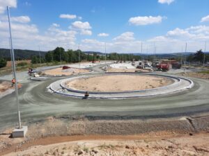 V rámci rozšíření a modernizace odpočívky Střechov v km 52 dálnice D1 ve směru na Prahu jsme vkročili do závěrečné fáze. V úterý 9.8.2022 probíhala pokládka podkladní vrstvy z mechanicky zpevněného kameniva na pojížděných komunikacích odpočívky (mimo stání pro kamiony) a dnes, tj. ve středu 10.8.2022, zahajujeme pokládku asfaltových hutněných vrstev. Souběžně se v jednotlivých částech pracuje na instalaci obrub, dláždění prstence okružní křižovatky nebo jednotlivých ostrůvků a dokončuje se betonáž ostrůvků stání pro kamiony. Probíhá osazení posledních sloupů veřejného osvětlení a současně jejich zapojení na rozvody nízkého napětí.