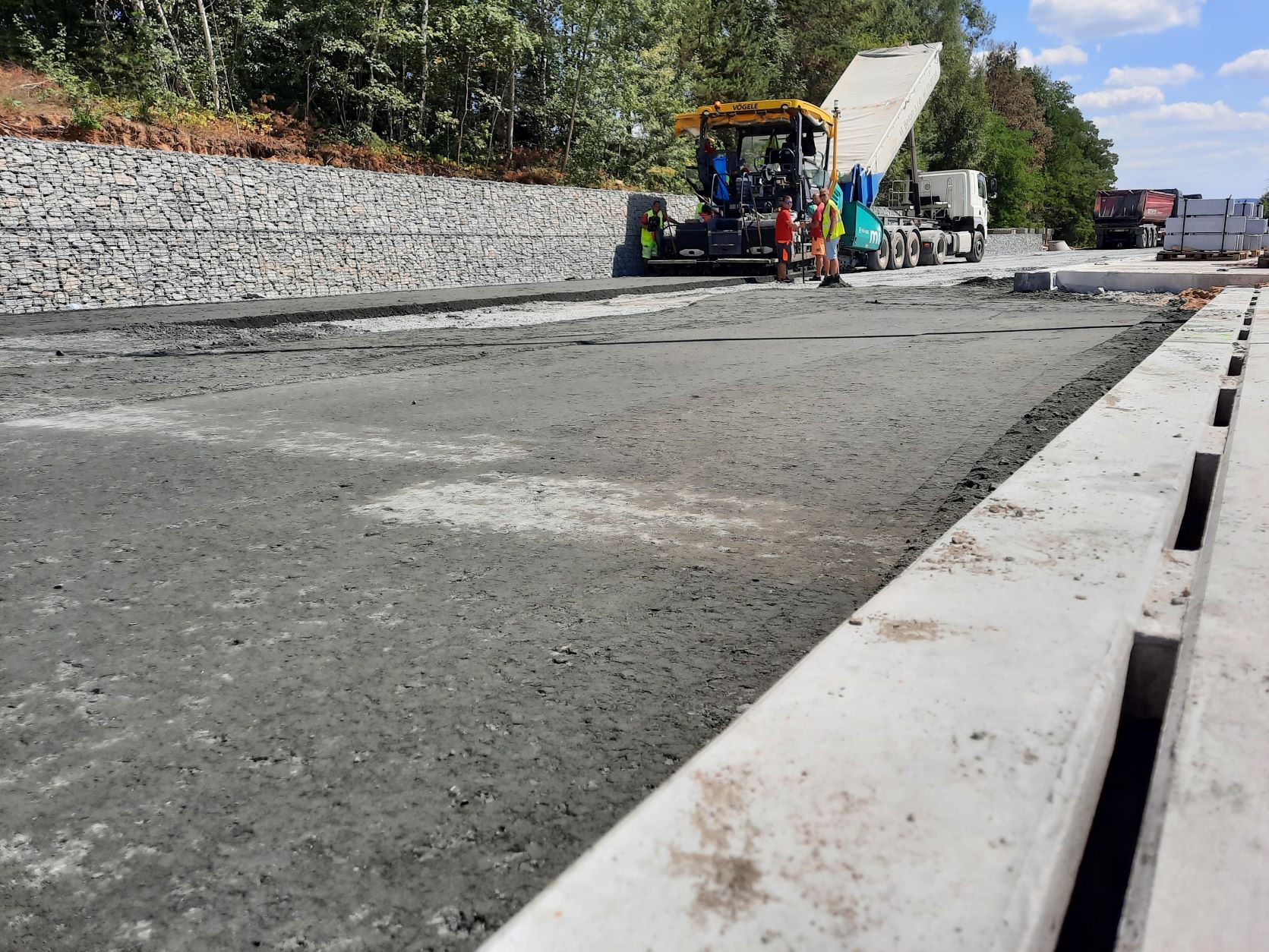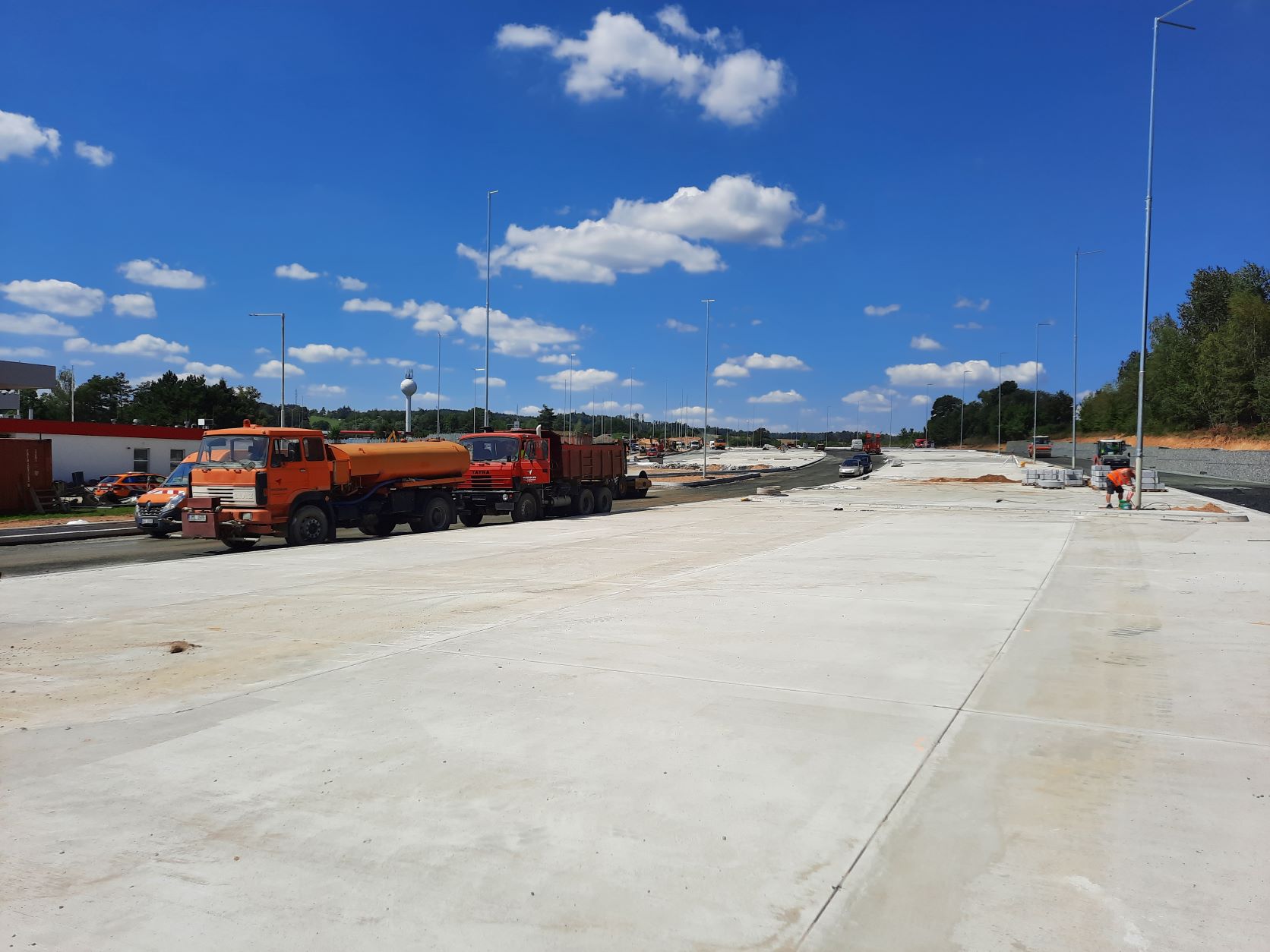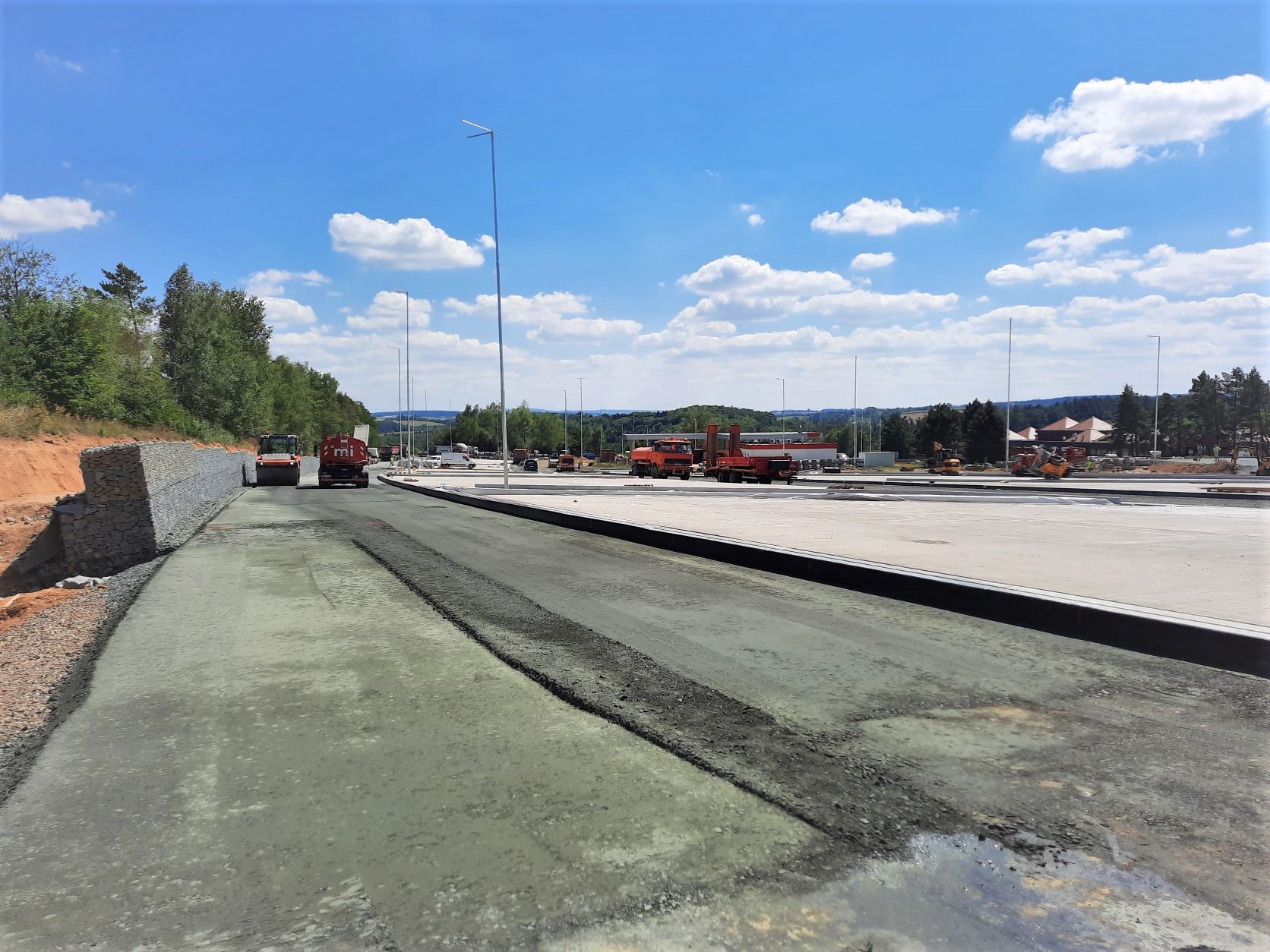 V rámci rozšíření a modernizace odpočívky Střechov v km 52 dálnice D1 ve směru na Prahu jsme vkročili do závěrečné fáze. V úterý 9.8.2022 probíhala pokládka podkladní vrstvy z mechanicky zpevněného kameniva na pojížděných komunikacích odpočívky (mimo stání pro kamiony) a dnes, tj. ve středu 10.8.2022, zahajujeme pokládku asfaltových hutněných vrstev. Souběžně se v jednotlivých částech pracuje na instalaci obrub, dláždění prstence okružní křižovatky nebo jednotlivých ostrůvků a dokončuje se betonáž ostrůvků stání pro kamiony. Probíhá osazení posledních sloupů veřejného osvětlení a současně jejich zapojení na rozvody nízkého napětí.
