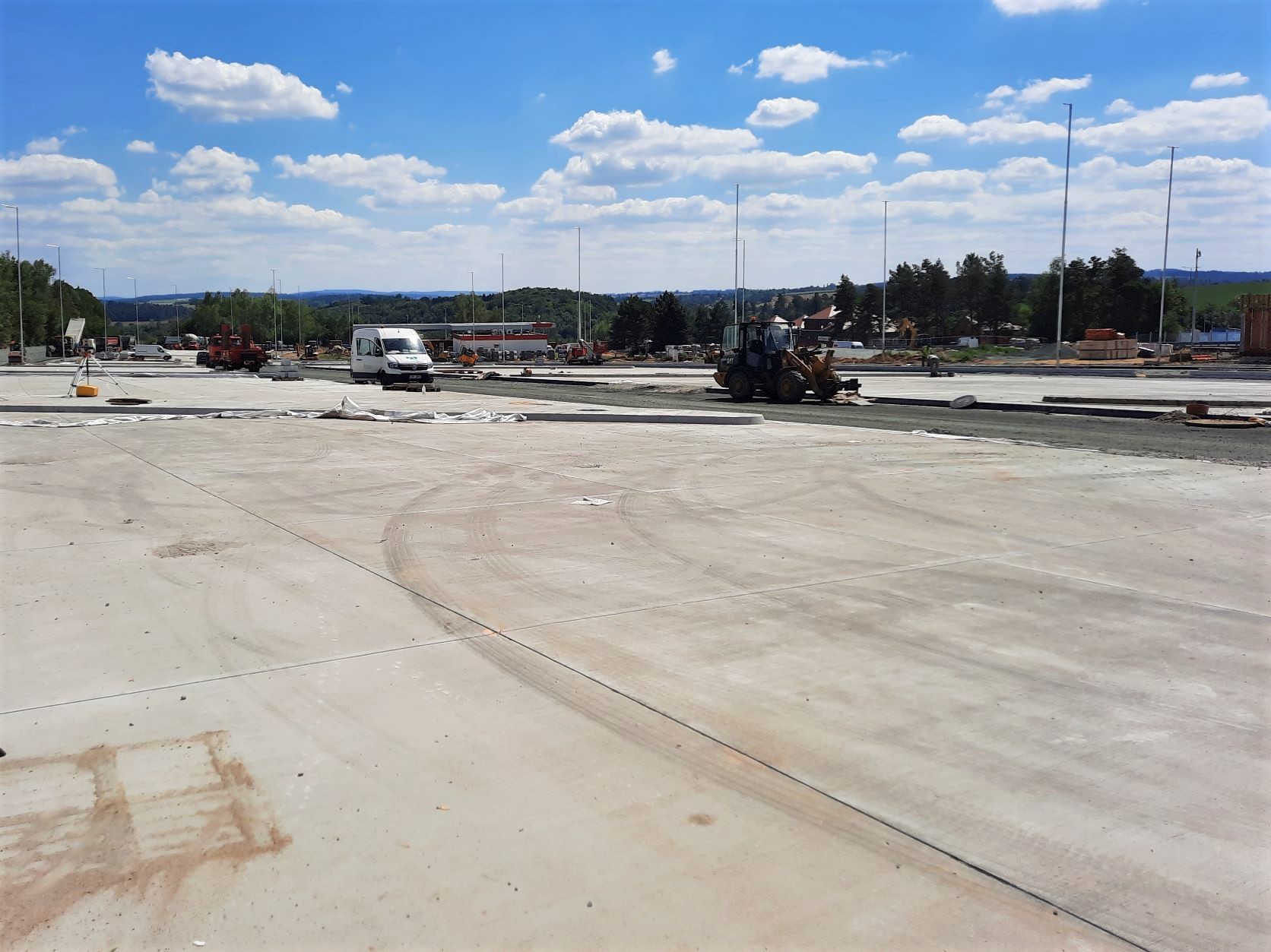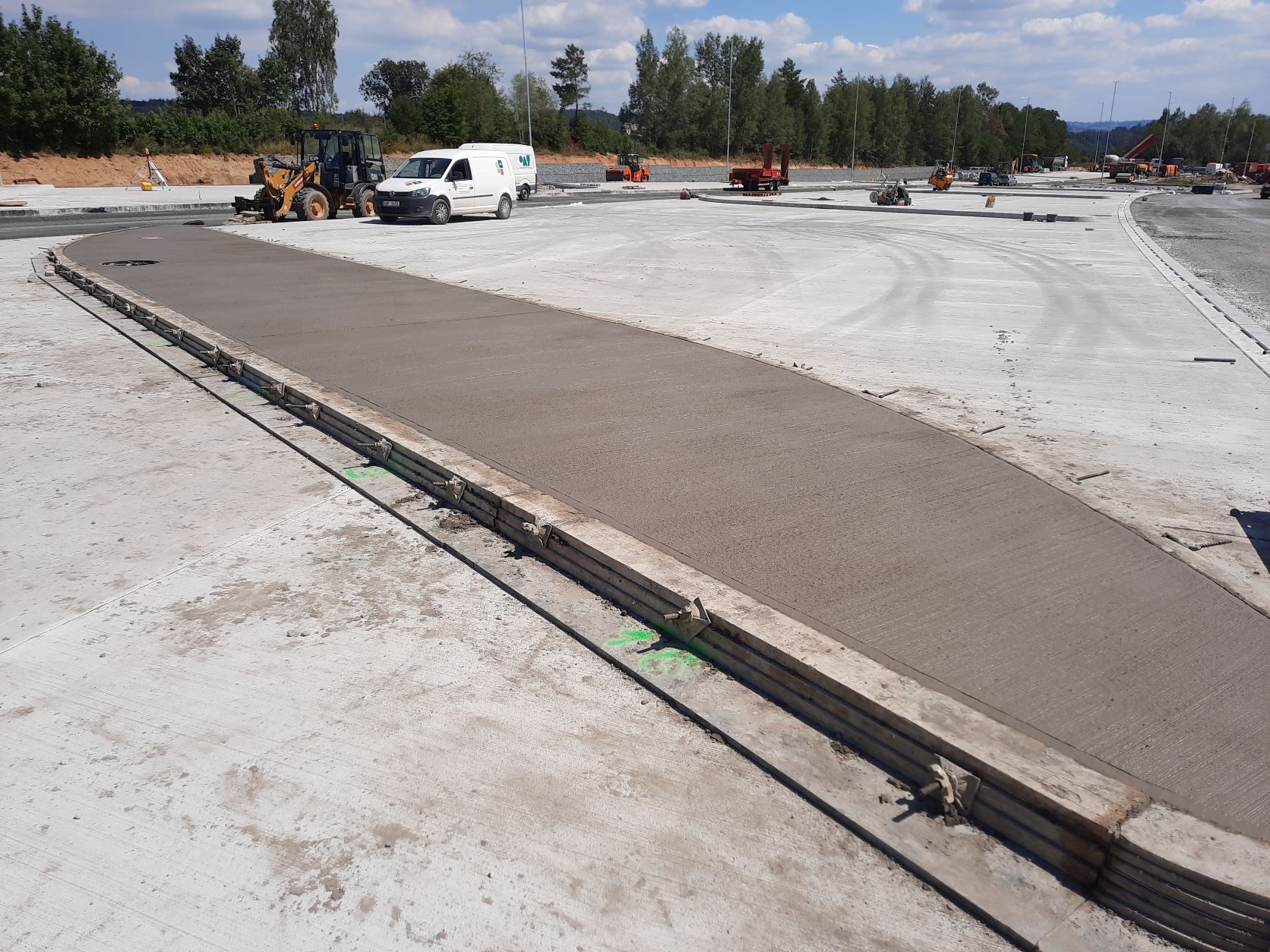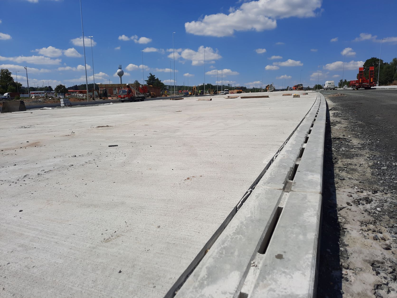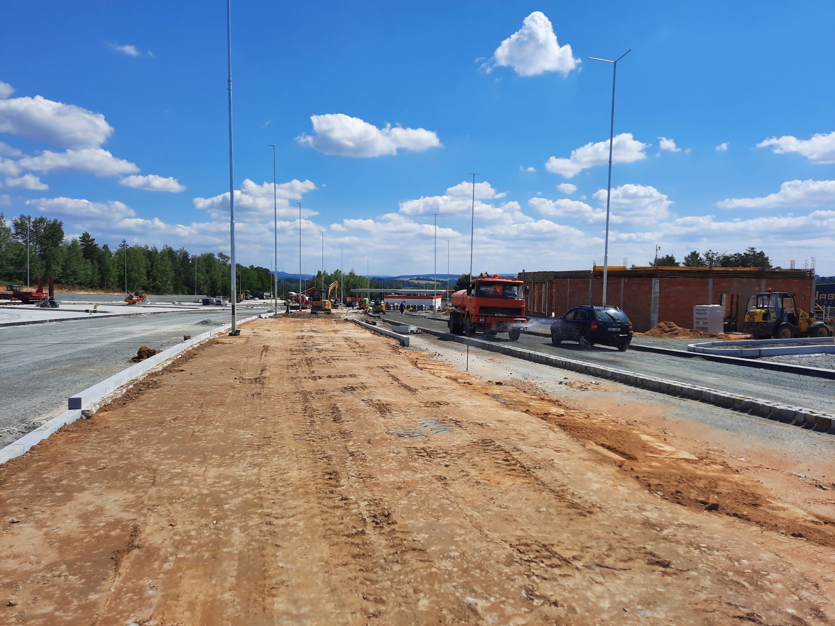 V rámci rozšíření a modernizace odpočívky Střechov v km 52 dálnice D1 ve směru na Prahu jsme vkročili do závěrečné fáze. V úterý 9.8.2022 probíhala pokládka podkladní vrstvy z mechanicky zpevněného kameniva na pojížděných komunikacích odpočívky (mimo stání pro kamiony) a dnes, tj. ve středu 10.8.2022, zahajujeme pokládku asfaltových hutněných vrstev. Souběžně se v jednotlivých částech pracuje na instalaci obrub, dláždění prstence okružní křižovatky nebo jednotlivých ostrůvků a dokončuje se betonáž ostrůvků stání pro kamiony. Probíhá osazení posledních sloupů veřejného osvětlení a současně jejich zapojení na rozvody nízkého napětí.