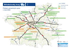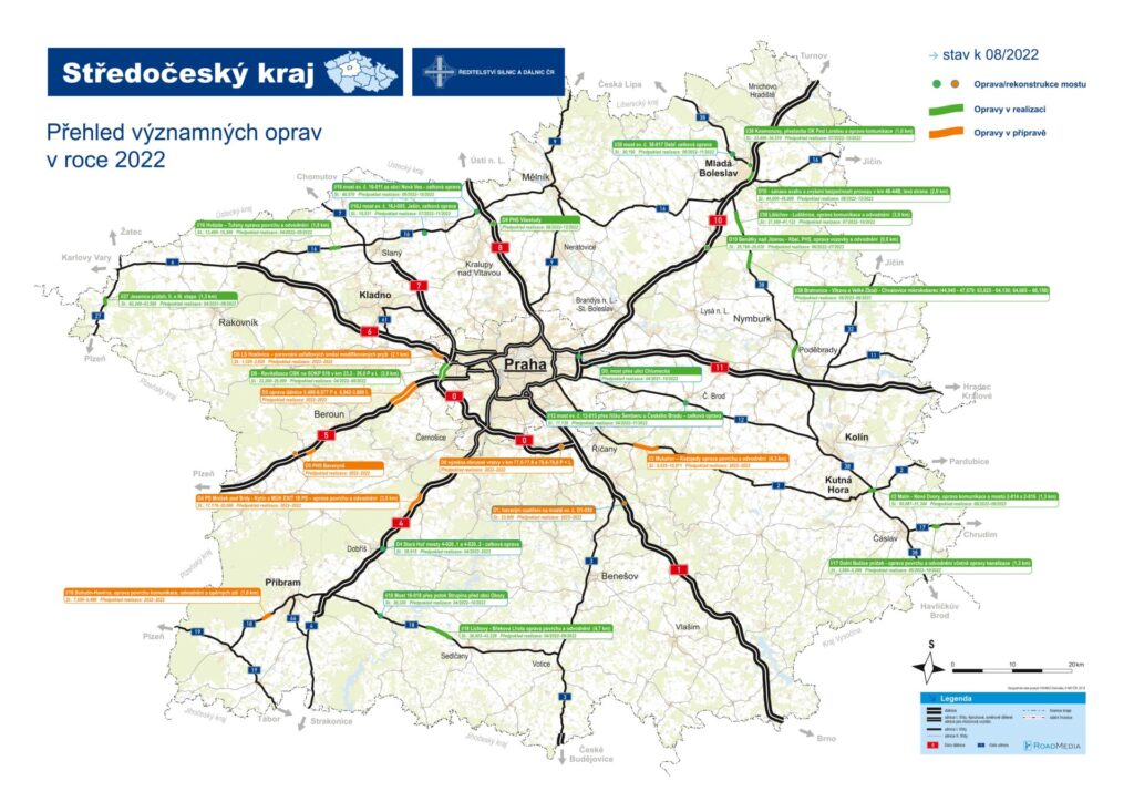 Významné opravy na silnicích I. tříd a dálnicích ve Středočeském kraji v srpnu ukazuje mapa. V tomto měsíci jsme například uvedli do provozu dopravně vytížený úsek silnice I/4 mezi Chrašticemi a hranicí s Jihočeským krajem a na dálnici D5 novou PHS podél Zdic. Naopak jsme zahájili sanaci svahu u Mladé Boleslavi na dálnici D10 a opravu silnice I/2 v úseku Malín-Nové Dvory na Kutnohorsku.
