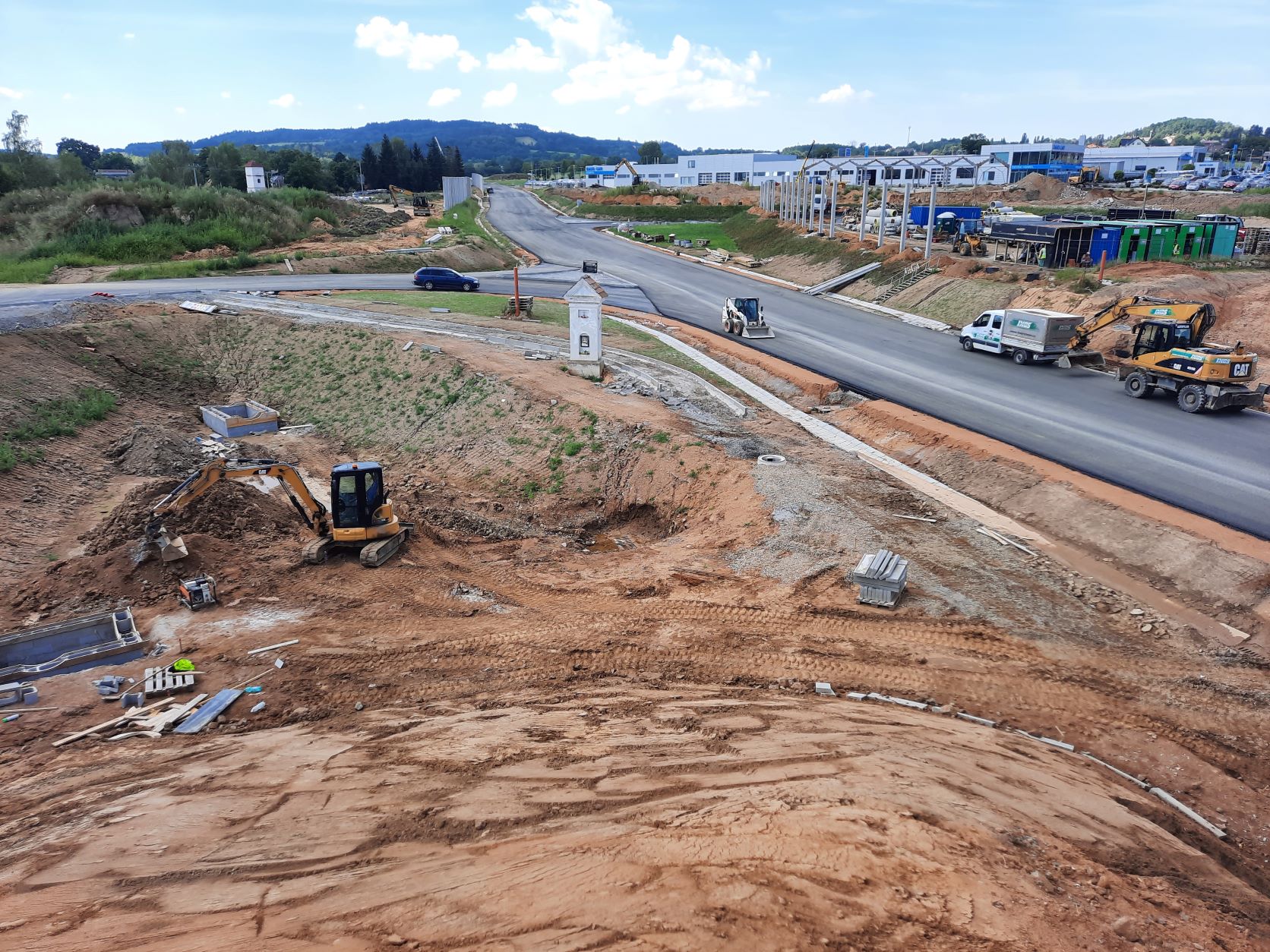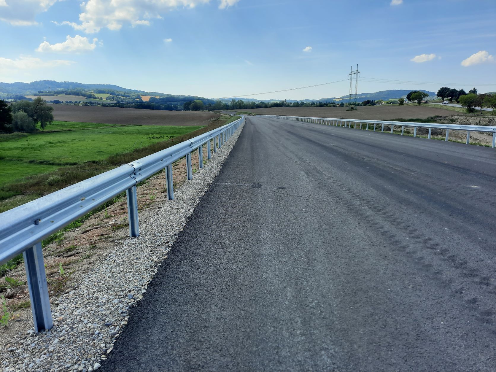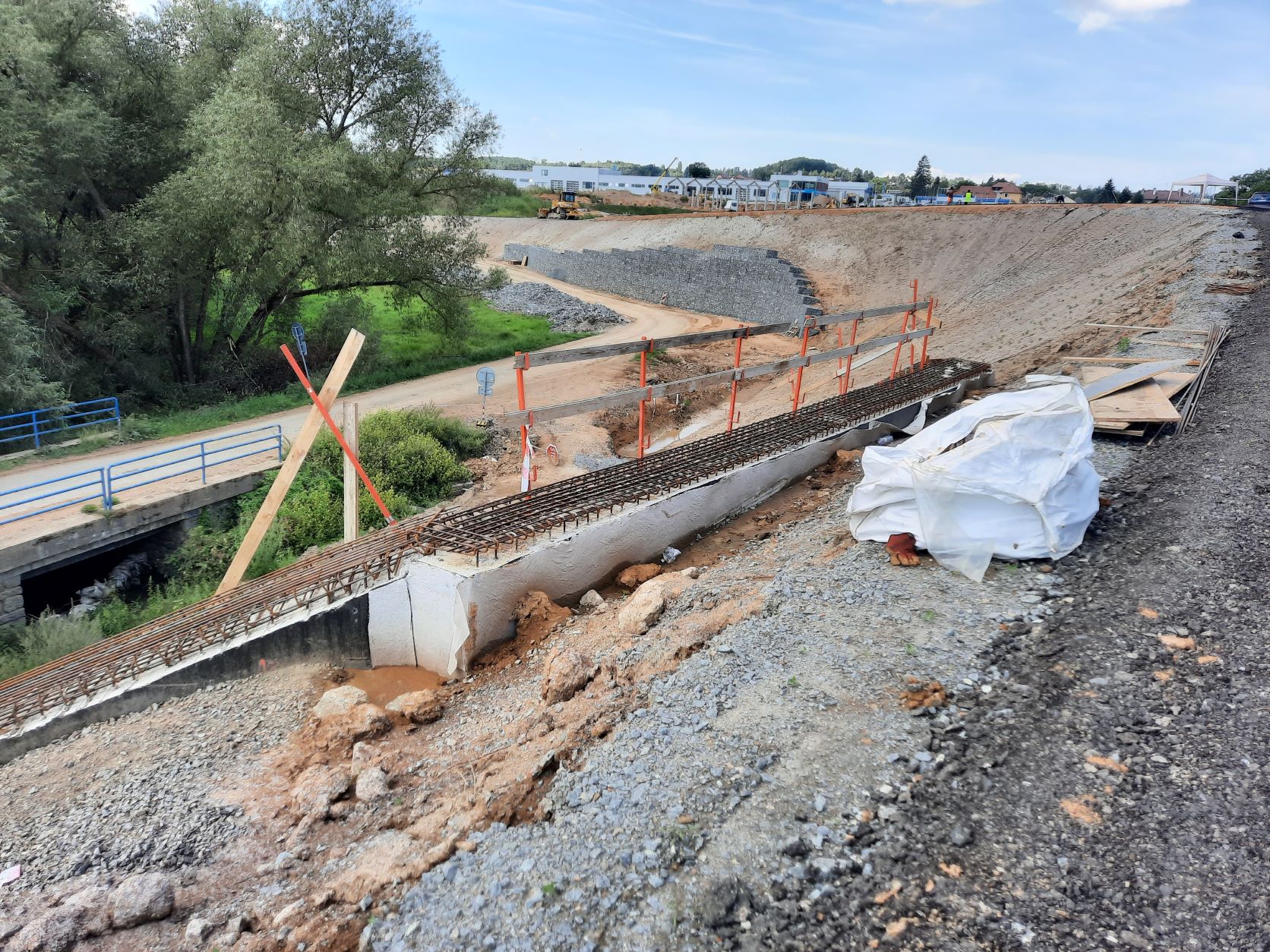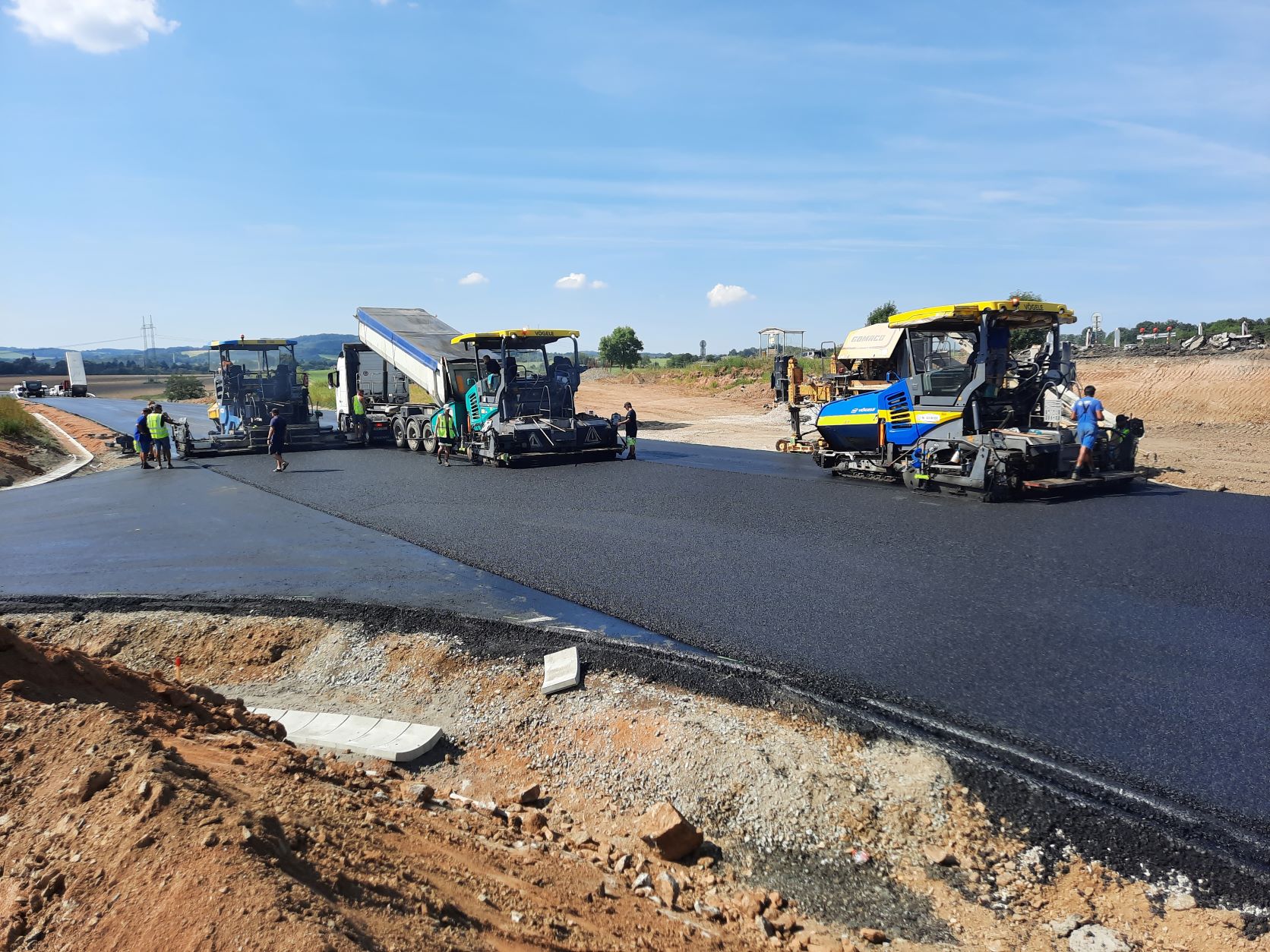 V minulém týdnu jsme dokončili pokládku obrusné vrstvy v téměř celé délce hlavní trasy vyjma míst přilehlých napojení obchvatu na stávající silnici I/3. V uplynulých týdnech se dále pracovalo na pokládce monolitických žlabů odvodnění metodo curb-king i formou skladby prefabrikovaných žlabovek. Dokončovaly se zemní krajnice a i osazování svodidel. Probíhala výstavba opěrné gabionové zdi zabezpečující násyp větve mimoúrovňové křižovatky. Na mostě přes hlavní trasu byly provedeny římsy a realizovala se izolace nosné konstrukce před položením litého asfaltu. Na mostě přes Konopišťský potok na sil. III/00336 je položeno asfaltové souvrství a zbývá dokončit betonáž říms. Komunikace III/00336 je kompletně přeložena s dokončenou obrusnou vrstvou i odvodněním. Kontinuálně se pracuje na stavbě protihlukových stěn a dokončení rámových mostů. Proběhlo ornicování svahů a postupně se podél komunikací aplikuje hydroosev. Další práce probíhají na chodnících osazováním jejich obrub a dlážděním. A samozřejmě se pracuje na nové křižovatce se silnicí III/1116.
