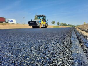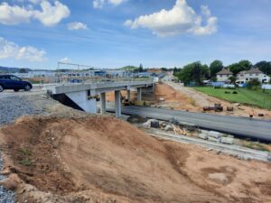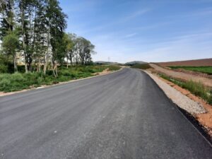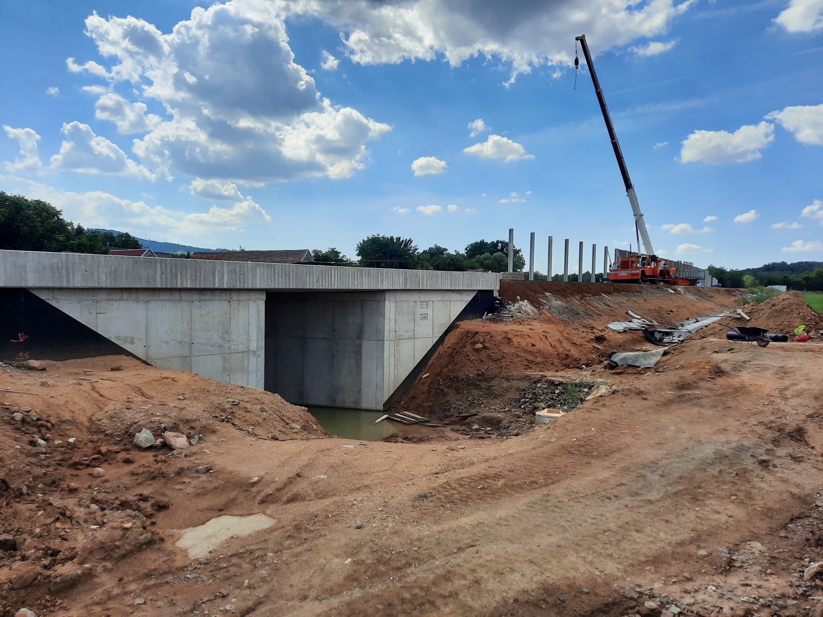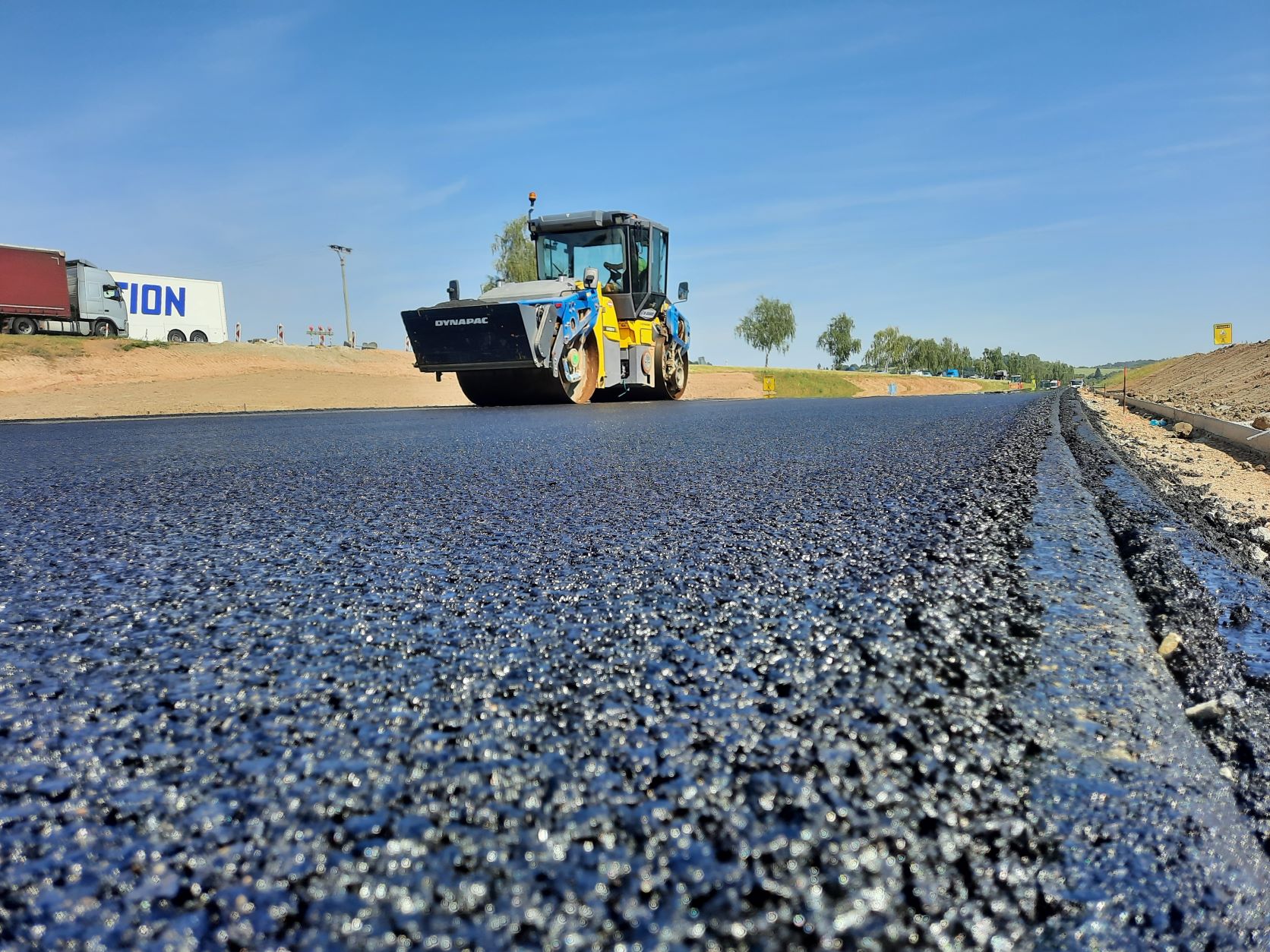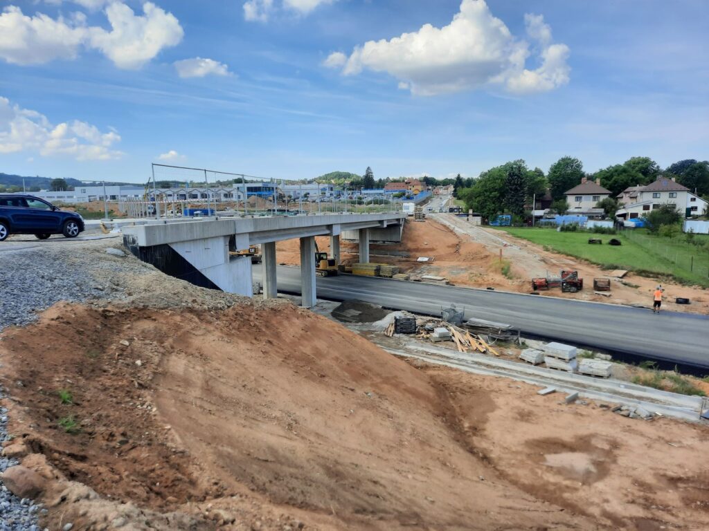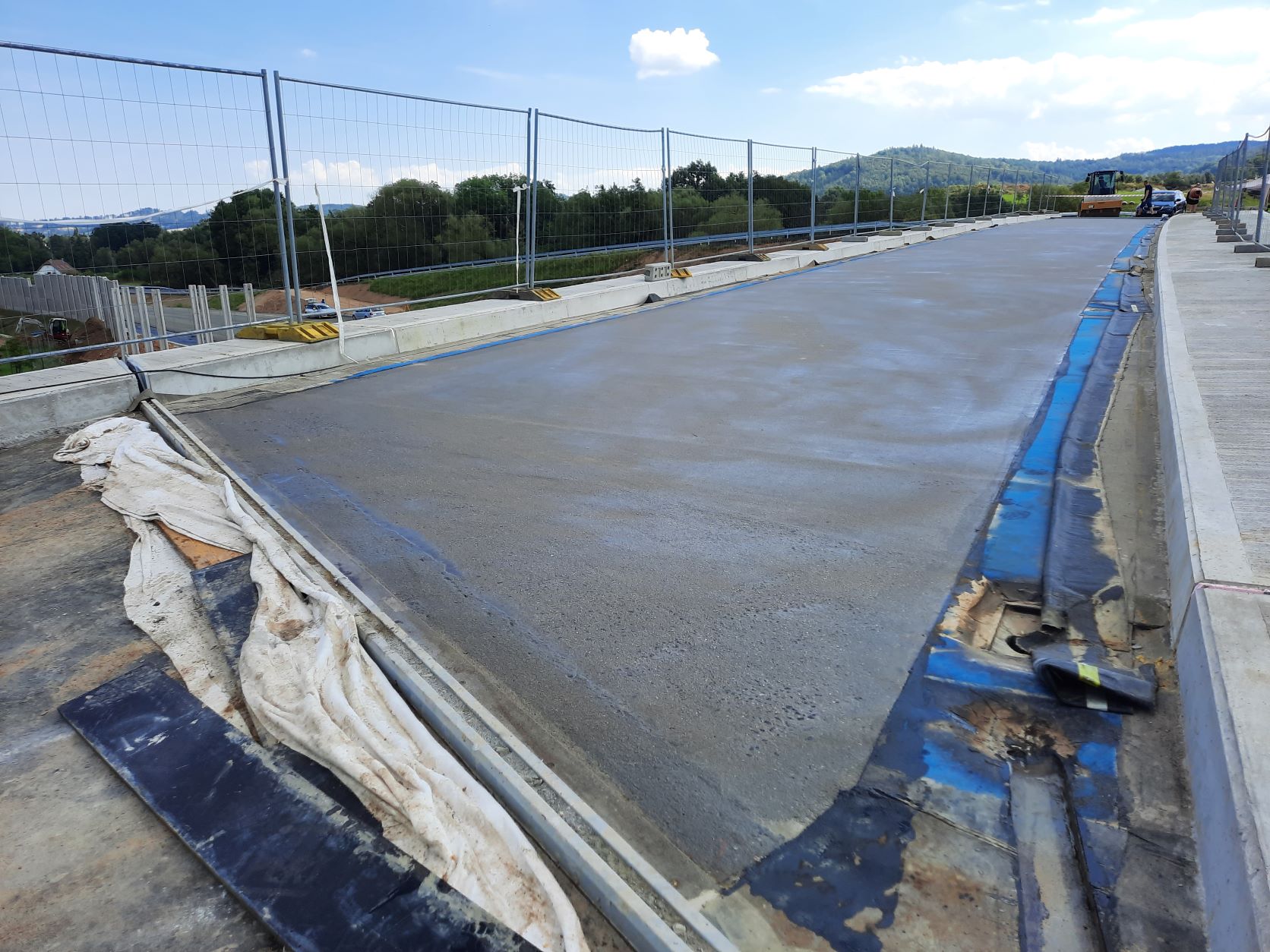 V minulém týdnu jsme dokončili pokládku obrusné vrstvy v téměř celé délce hlavní trasy vyjma míst přilehlých napojení obchvatu na stávající silnici I/3. V uplynulých týdnech se dále pracovalo na pokládce monolitických žlabů odvodnění metodo curb-king i formou skladby prefabrikovaných žlabovek. Dokončovaly se zemní krajnice a i osazování svodidel. Probíhala výstavba opěrné gabionové zdi zabezpečující násyp větve mimoúrovňové křižovatky. Na mostě přes hlavní trasu byly provedeny římsy a realizovala se izolace nosné konstrukce před položením litého asfaltu. Na mostě přes Konopišťský potok na sil. III/00336 je položeno asfaltové souvrství a zbývá dokončit betonáž říms. Komunikace III/00336 je kompletně přeložena s dokončenou obrusnou vrstvou i odvodněním. Kontinuálně se pracuje na stavbě protihlukových stěn a dokončení rámových mostů. Proběhlo ornicování svahů a postupně se podél komunikací aplikuje hydroosev. Další práce probíhají na chodnících osazováním jejich obrub a dlážděním. A samozřejmě se pracuje na nové křižovatce se silnicí III/1116.