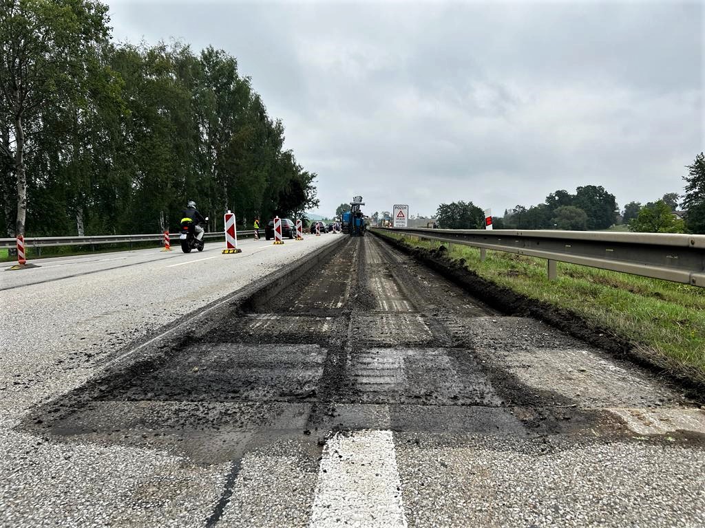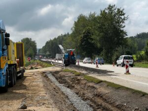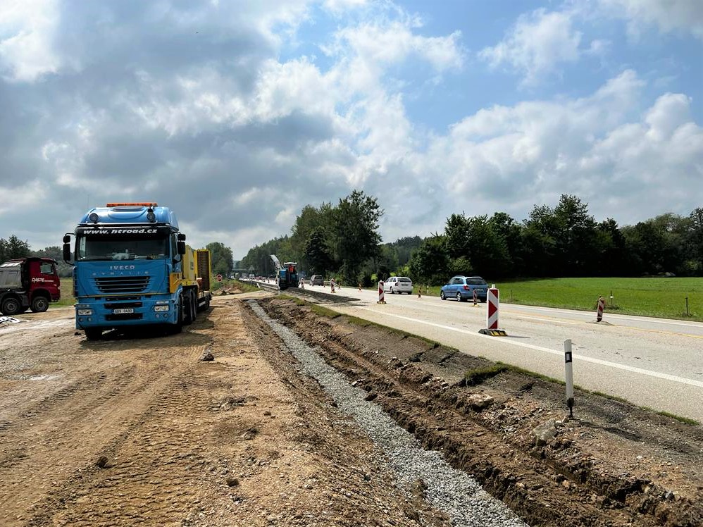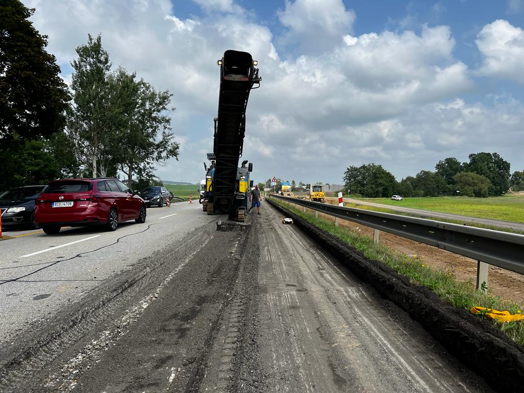 Jelikož se stavba dostává do své závěrečné fáze před uvedením obchvatu do provozu, zahájili jsme dnes frézováním krajnice silnice I/3 práce na jejím napojení na hlavní trasu obchvatu ve směru od Votic (viz. foto níže). To je také důvodem omezení rychlosti za MÚK Veselka, neboť se pracuje za provozu a v místě prací se jezdí 2 provizorními jízdními pruhy, abychom zde zajistili v závěru prázdnin a na začátku nového školního roku maximálně možnou propustnost silnice I/3, což je také našim cílem v celém průběhu prací na napojení na obou stranách. V polovině září, plánujeme zahájit práce na propojení obchvatu a stávající silnice I/3 na opačné straně, tedy ve směru od Benešova. Tady ještě musíme vybudovat obousměrnou provizorní komunikaci, na kterou následně převedeme provoz.