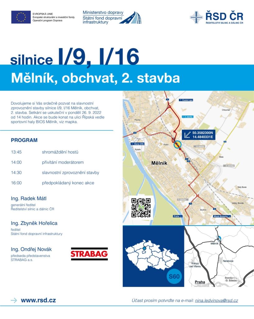 V pondělí 26.9.2022 ve 14:00 hodin bude do provozu slavnostně uvedena 2. stavba obchvatu Mělníka na sil. I/9, I/16. Akce se bude konat na ulici Řípská vedle sportovní haly BIOS Mělník, viz mapka.