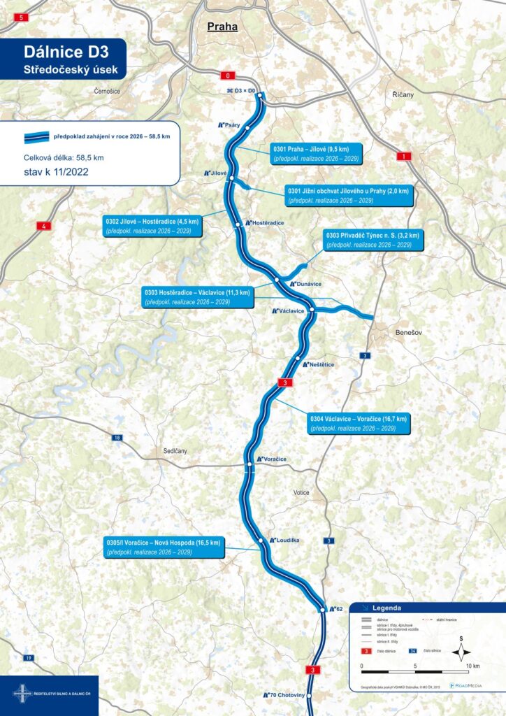 Jak jsme už v průběhu tohoto roku informovali, v trase dálnice probíhá podrobný geotechnický průzkum, jehož výsledky, které budou k dispozici na konci příštího roku, budou sloužit jako stěžejní podklad pro zpracování dokumentace pro stavební povolení. V tuto chvíli jsou již také vydána všechna rozhodnutí o výjimkách ze zvláště chráněných druhů živočichů, která jsou nezbytná pro zisk územního rozhodnutí. Nicméně již došlo k jejich napadení žalobou a budou tedy ještě podrobeny soudnímu přezkumu.