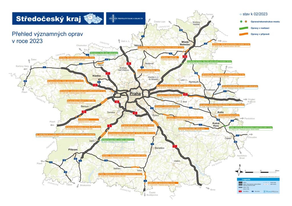 V letošní stavební sezóně plánujeme dokončit 5 opravy, které jsme zahájili v roce 2022. Na dálnicích je to most na D4 u Staré Huti a na D10 dokončíme opravu PHS a estakády u Kbel. Samostatně je třeba zmínit opravu obou jízdních pásů dálnice D1 v km 16-20,845. V tomto 5 kilometrů dlouhém úseku jsme zahájili přípravné práce na mostě a PHS ještě ve 3. čtvrtletí loňského roku s cílem zprovoznit opravený úsek jako celek v závěru stavební sezóny 2023. Z tohoto důvodu také plánujeme obnovit práce v levém jízdním pásu (směr Praha) inkriminovaného úseku D1 už v pondělí 6. 3. 2023. Přípravná fáze výstavby dopravě inženýrského opatření probíhá v časových oknech již od 18. 2. 2023. Pokud jde o silnice I. tříd, tady nám zbývá dokončit opravu povrhu a mostu v úseku Malín – Nové Dvory na silnici I/2 a most u Ješína na silnici I/16J.