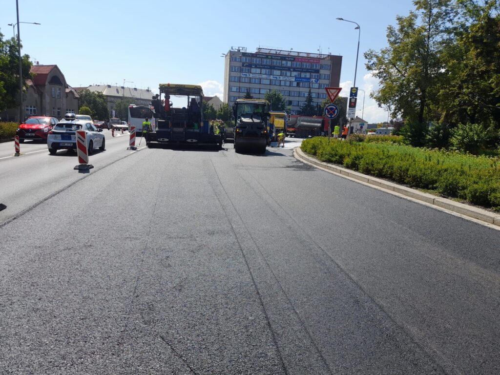 V uplynulých třinácti týdnech jsme starý povrch vozovky plný trhlin, s ulámanými okraji a lokálně vyjetými kolejemi odfrézovali do hloubky čtyřiceti milimetrů a položili nový asfaltový koberec. Povrch kruhového objezdu jsme kvůli výraznějším poruchám vyfrézovali dokonce o šedesát milimetrů hlouběji. Zároveň jsme opravili povrch autobusových zálivů, obnovili systém odvodnění i vodorovné a svislé dopravní značení.