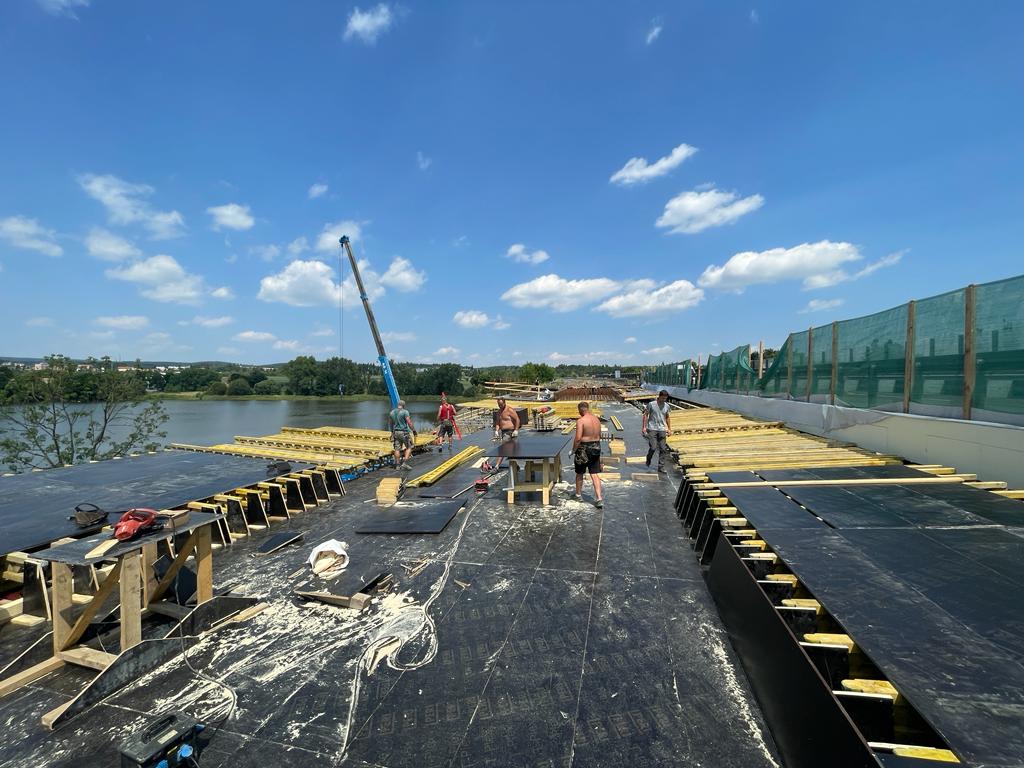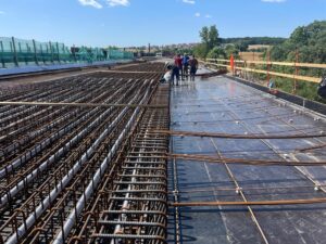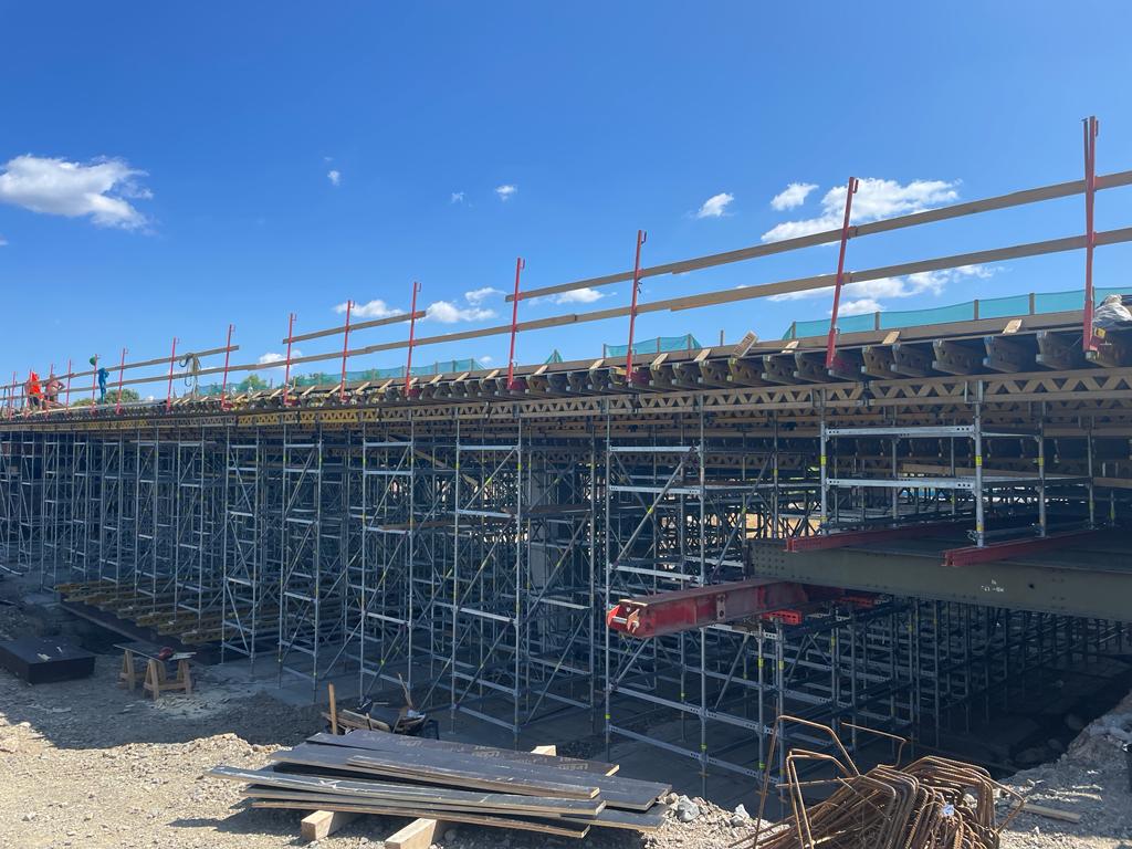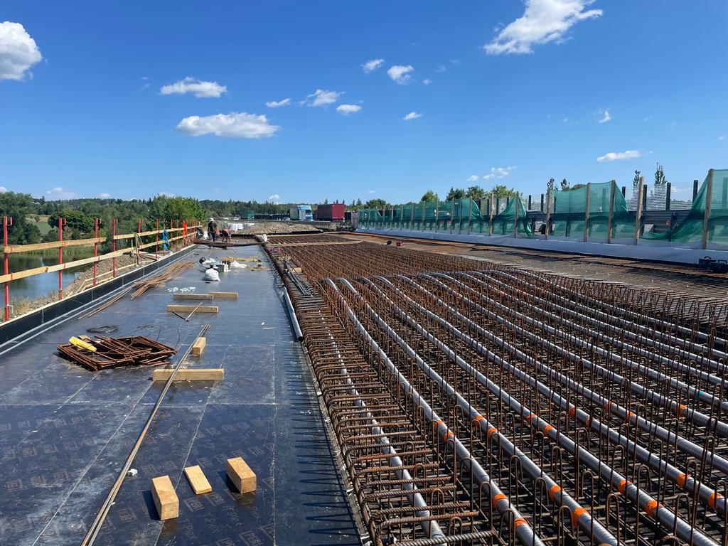 V tuto chvíli už celá mostní konstrukce stojí, vážou se ocelové výztuže a připravujeme betonáž mostovky. Proti původnímu stavu dochází ke změně konstrukce z prefabrikované na monolitickou. Kvůli lepší statice jsme také upravili poměr a rozpětí polí mostů. Původní rozpětí bylo 18+18+18 metrů, nově je to 16+24+16 metrů.
