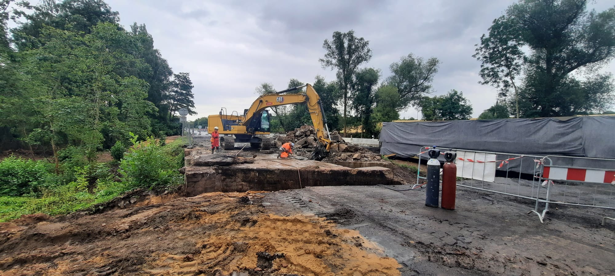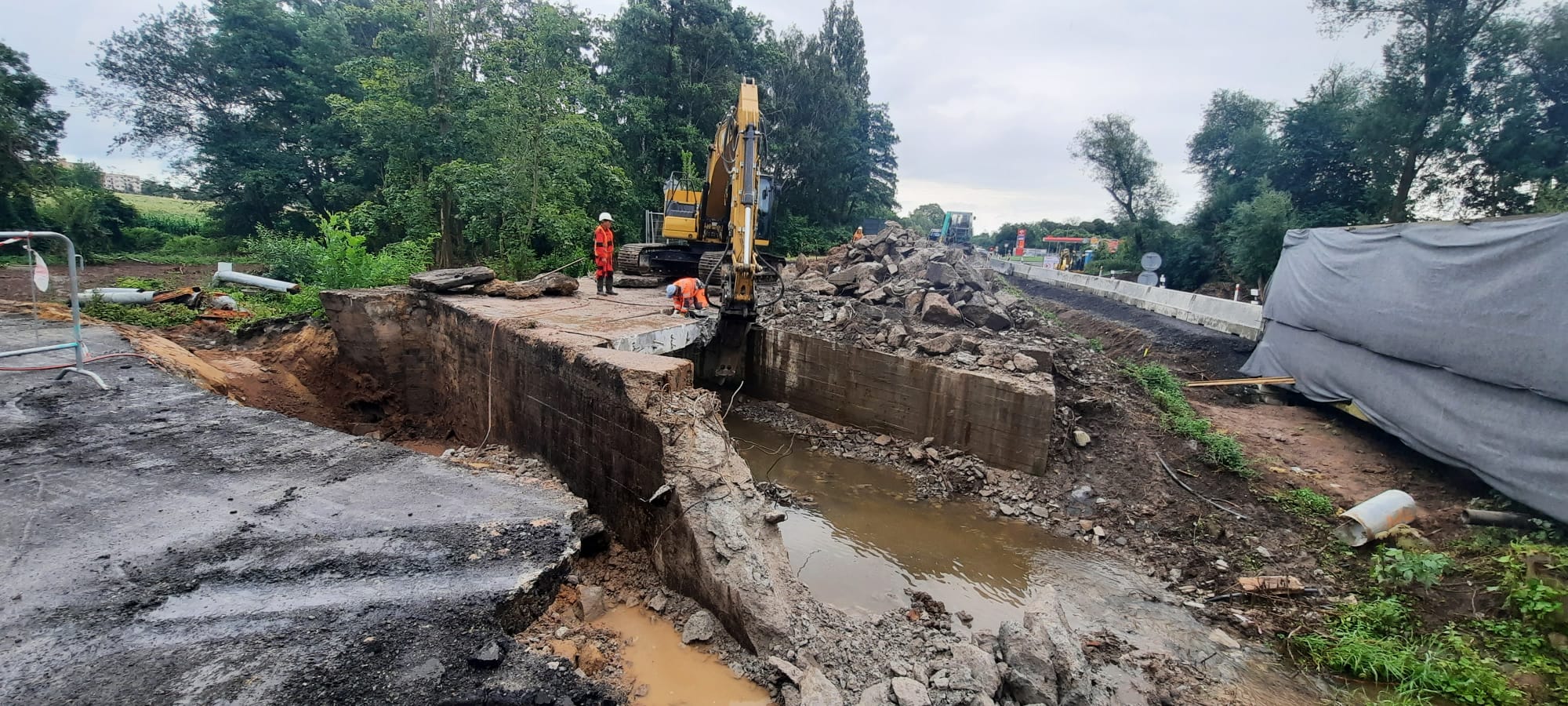 Po odfrézování asfaltového souvrství z mostovky jí začínáme po kusech bourat. Diagnostika totiž prokázala špatný stav nosné konstrukce, do které navíc vlivem nefunkčního izolačního systému zatékalo. Naopak spodní stavba je v uspokojivém stavu, a tak na ní v průběhu následujících měsíců postavíme most nový. Nejenže tím prodloužíme jeho životnost, ale zároveň se tím zvýší i bezpečnost silničního provozu, protože most bude opatřen mimo jiné zcela novým zábradlím. Práce navíc budou spočívat i v úpravě koryta potoku pod mostem tak, aby ho voda nepodemílala.