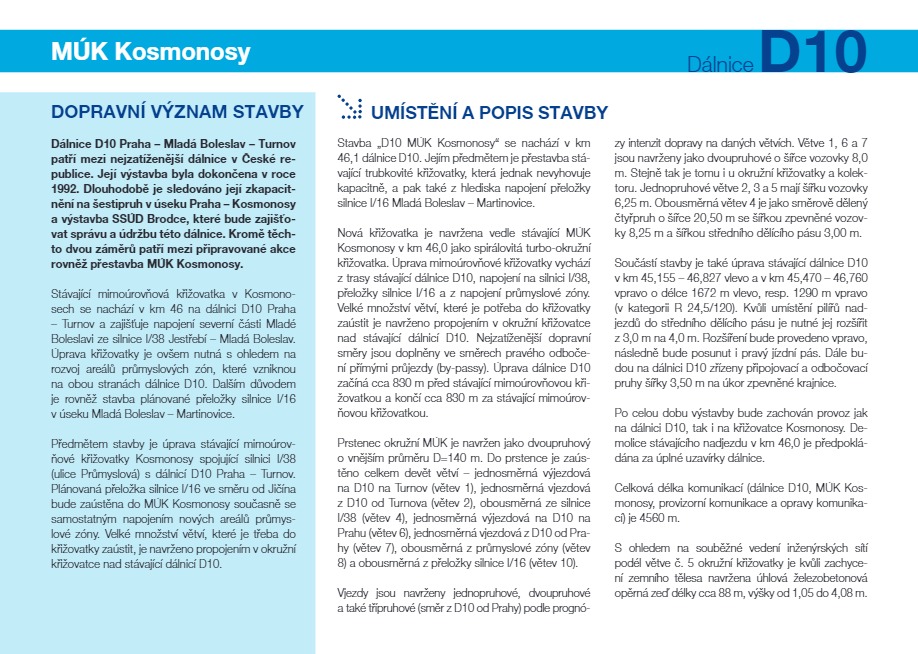 Ředitelství silnic a dálnic dnes zahajuje přestavbu mimoúrovňové křižovatky Kosmonosy na dálnici D10. Křižovatka se nachází na 46. kilometru a aktuálně na dálnici D10 napojuje pouze silnici I/38.
