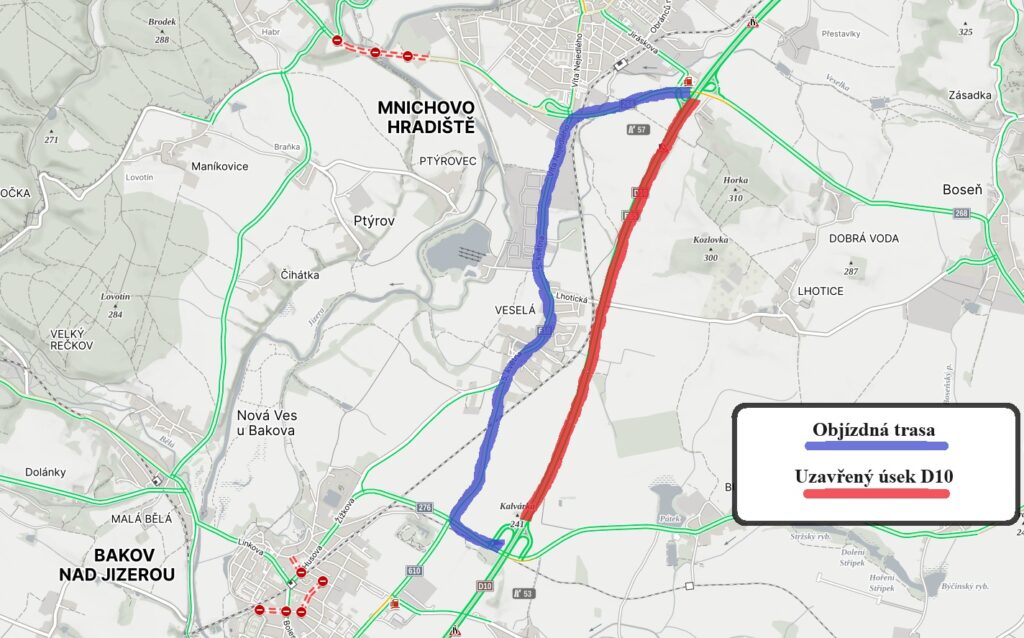 Za uzavřený pravý pás dálnice ve směru na Liberec bude vyznačena objížďka z mimoúrovňové křižovatky Bakov nad Jizerou (EXIT 53) dále po silnici II/276 přes obec Veselá směrem na Mnichovo Hradiště a po silnici II/268 na mimoúrovňovou křižovatku Mnichovo Hradiště (EXIT 57) a zpět na dálnici D10.