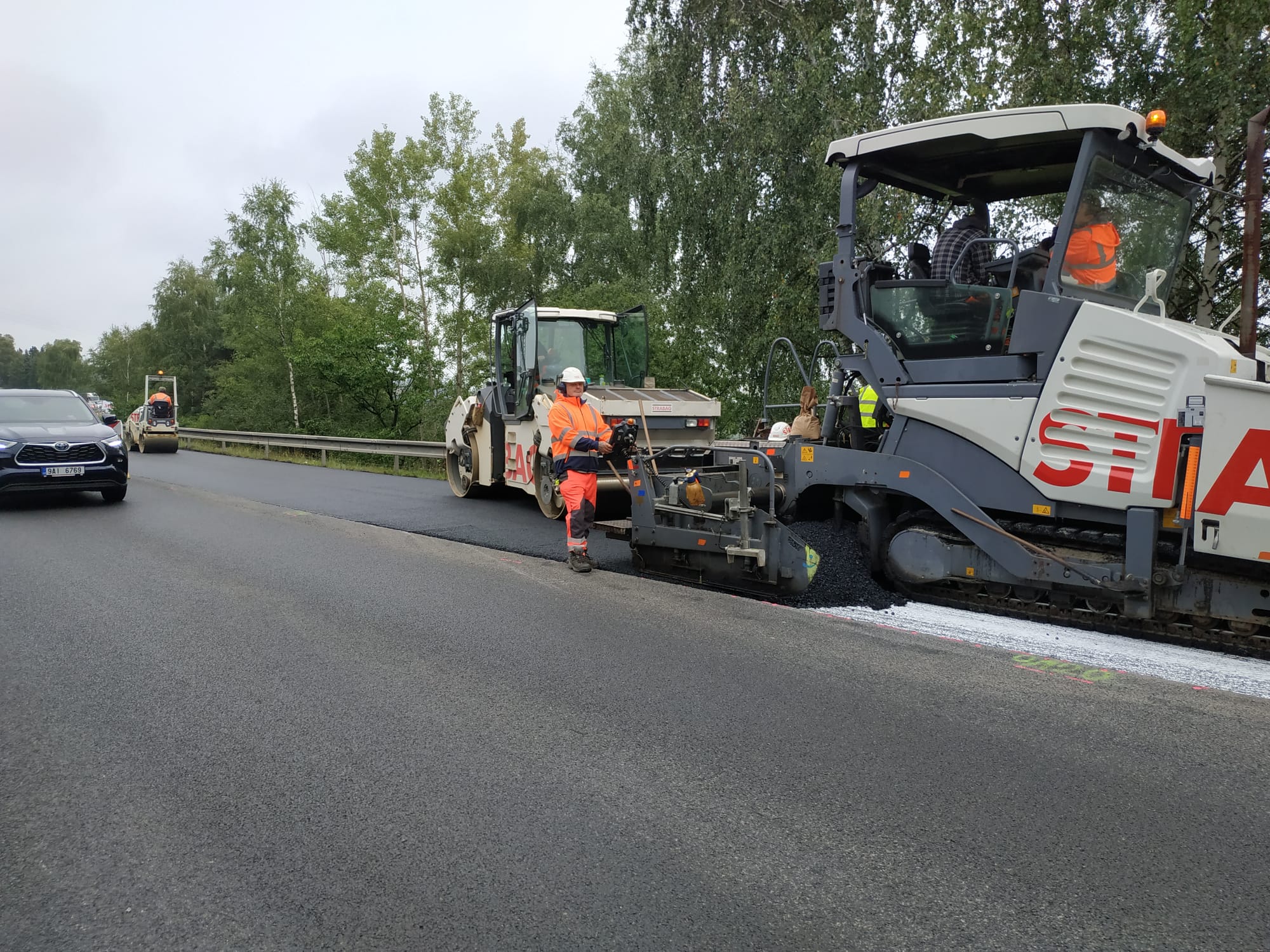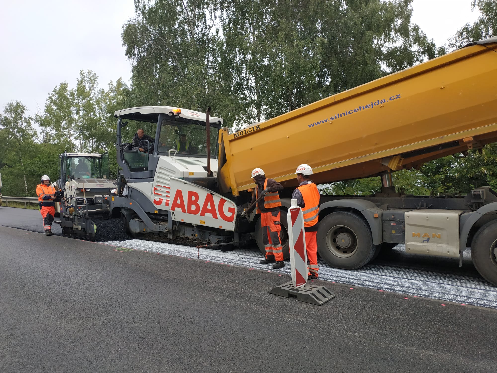 V těchto dnech se práce soustřeďují ve střední části průtahu a pak také na jeho konci, který je příjezdem ve směru od Tábora. I zde vybudujeme vybočovací ostrůvek a hodláme zcela vyměnit asfaltový povrch. Ten je totiž na přibližně 300 m dlouhém úseku zasažený kavernami, ztrátou asfaltového tmelu a místy se vyskytuje hloubková koroze. Vozovka je navíc poznamenaná častými lokálními vysprávkami.