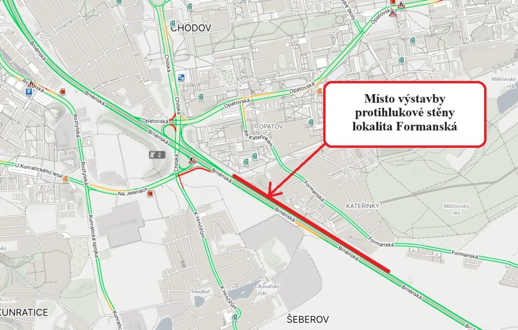 Protihluková stěna bude vystavěna podél někdejší části D1, která byla letos předána do správy hlavního města Prahy a patří k těm nejzatíženějším v celé ČR. Jde konkrétně o 4. – 3. kilometr komunikace, na příjezdu do Prahy ve směru od Brna vpravo, mezi odpočívkou a zemním valem. Denně tudy projede na 80 tisíc vozidel, z toho přibližně 20% tvoří nákladní auta a kamiony. Hygienická měření zde prokázala nadlimitní hluk z dopravy, proto bylo rozhodnuto o stavbě, jejímž hlavním účelem bude ochránit obyvatele lokality Formanská před škodlivým hlukem.