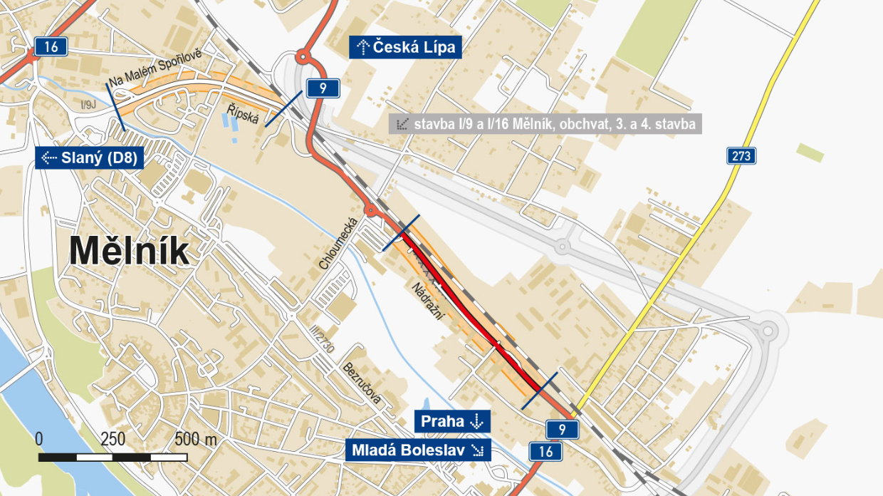 Stavba vede souběžně s koridorem železniční trati Všetaty – Děčín – Prostřední Žleb a její součástí budou přeložky inženýrských sítí, včetně odvodnění Nádražní ulice. Zároveň dojde k úpravě všech stávajících napojení na silnici I/9, I/16, komunikace pro pěší, autobusové zastávky a opravě odvodnění silnice I/9, I/16 v úseku ulice Řípská – Na Malém Spořilově. Plány počítají s vybudováním nové kanalizace s DUN a odlučovačem ropných látek se zaústěním do říčky Pšovka. V tomto úseku (nyní označen jako I/9J) bude dále provedena i oprava asfaltové vozovky (ložné a obrusné vrstvy) na komunikaci.