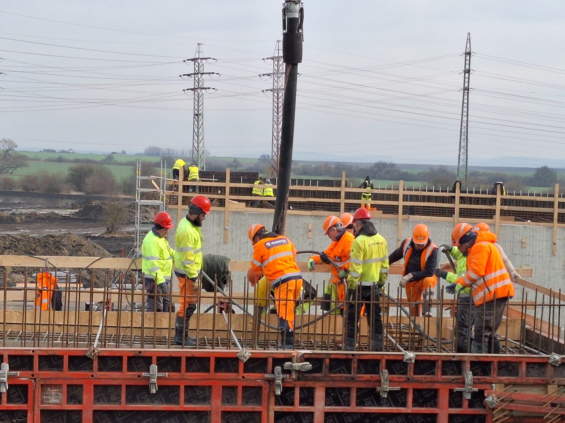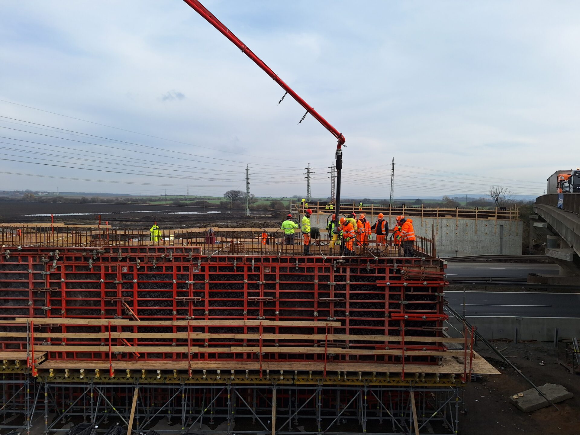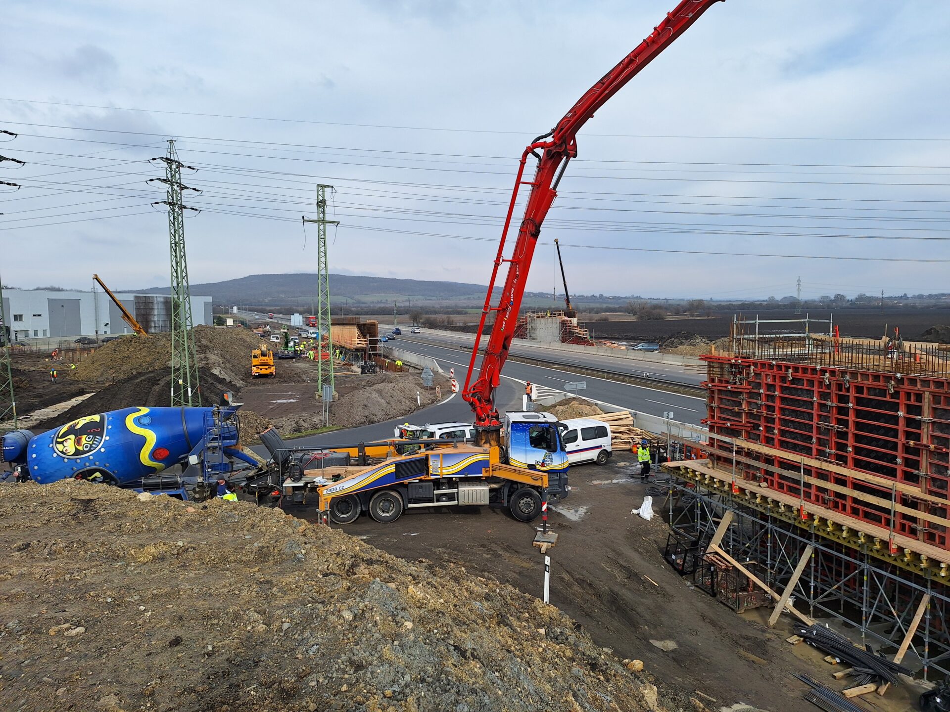 Na každé straně dálnice bude v rámci stavby vybudováno po dvou opěrách. Na každou z nich bude využito až 400 kubíků betonové směsi. Práce se drží harmonogramu. Vedle betonáže i nadále pokračují přeložky plynovodu, nebo vedení vysokého napětí.