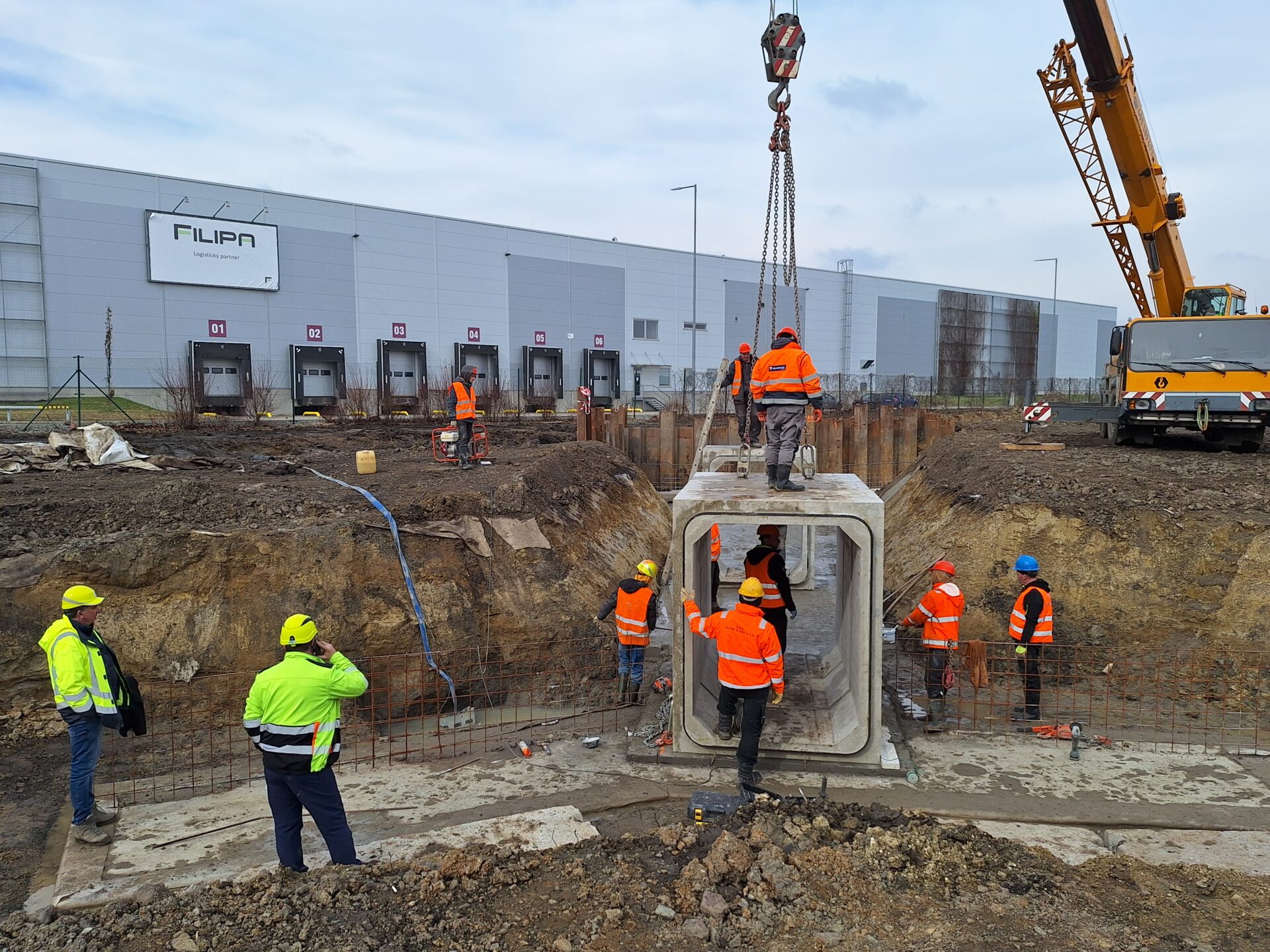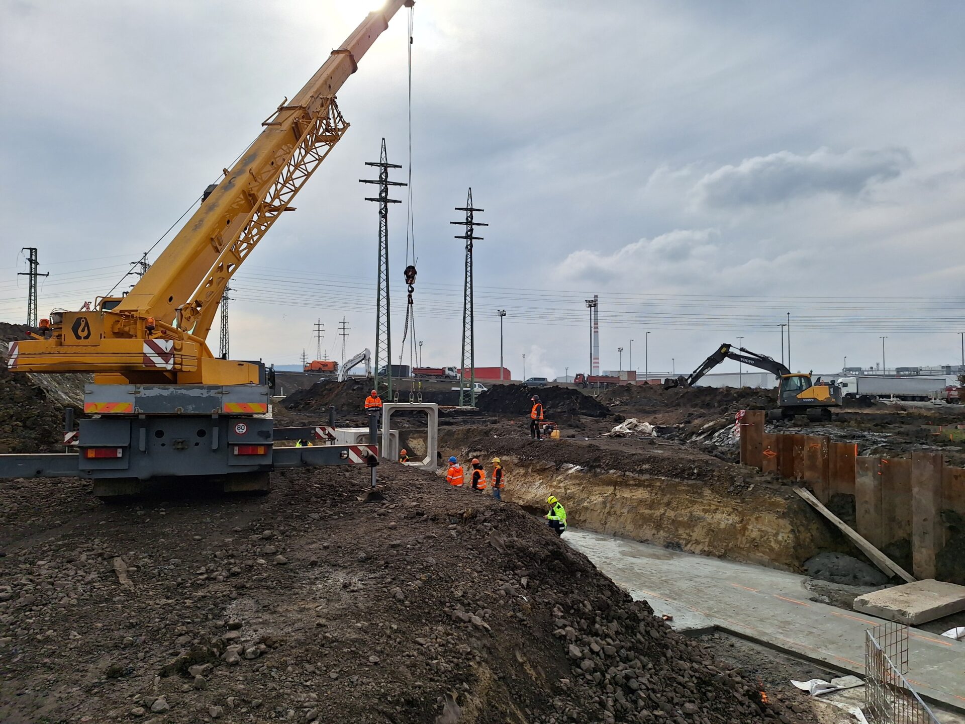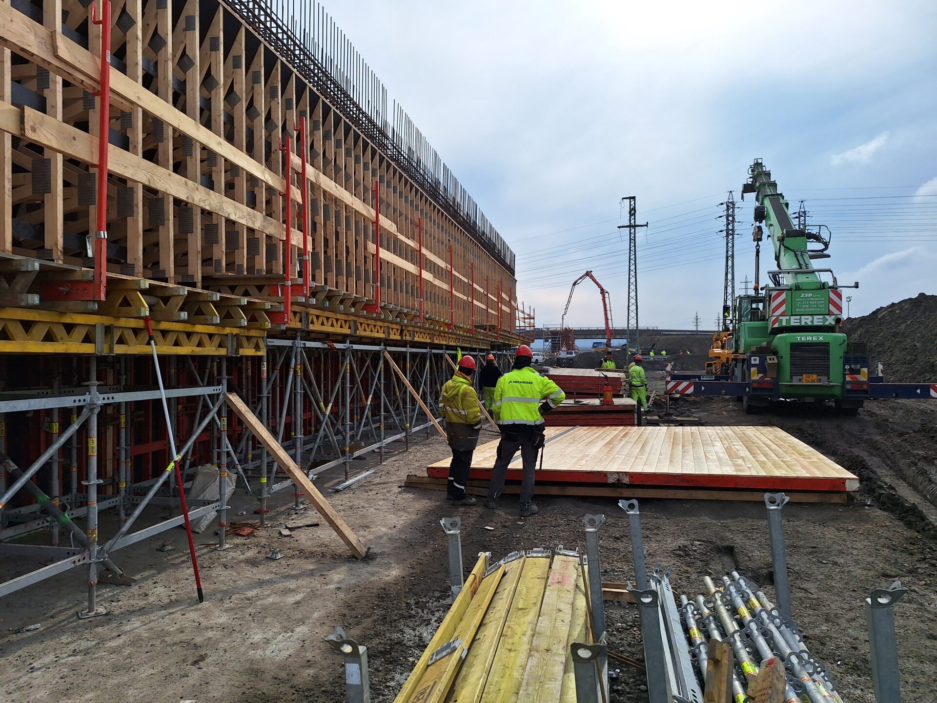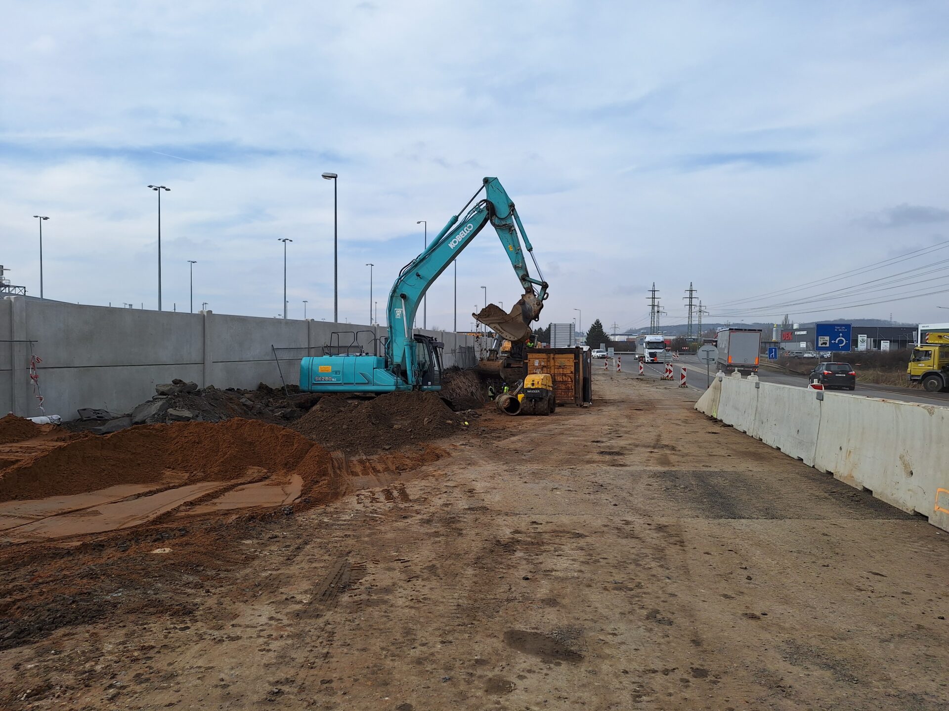 Na každé straně dálnice bude v rámci stavby vybudováno po dvou opěrách. Na každou z nich bude využito až 400 kubíků betonové směsi. Práce se drží harmonogramu. Vedle betonáže i nadále pokračují přeložky plynovodu, nebo vedení vysokého napětí.