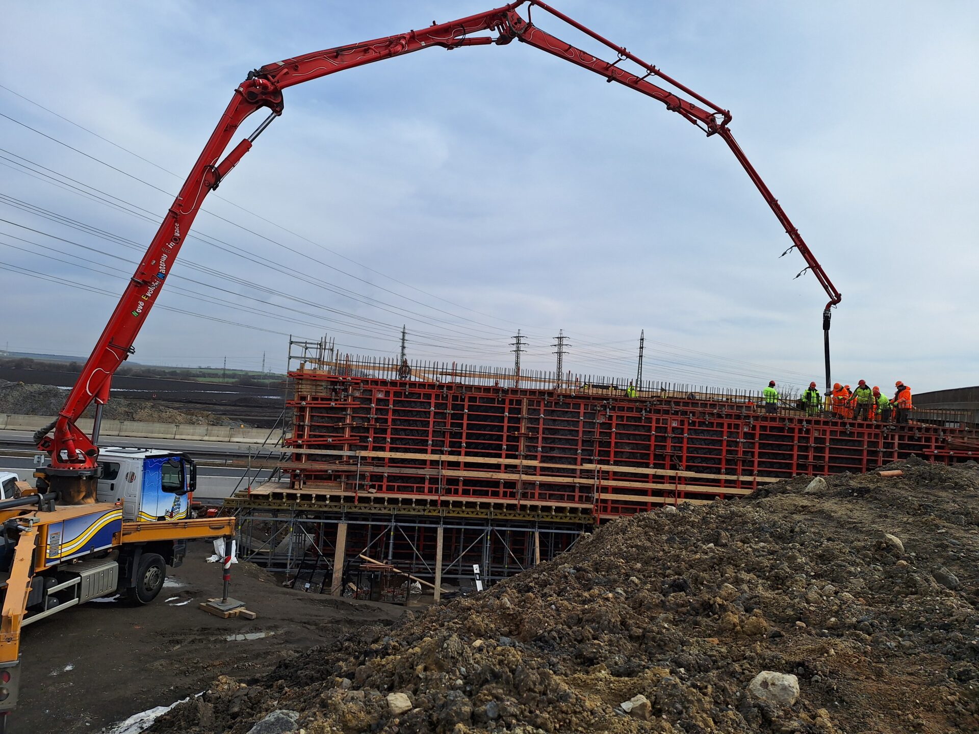 Se stovkami kubíků betonu se v těchto dnech pracuje na dálnici D10 u Kosmonos. Odstartovala totiž betonáž mostních opěr, které jsou jedním z podstatných základů přestavované mimoúrovňové křižovatky.