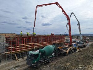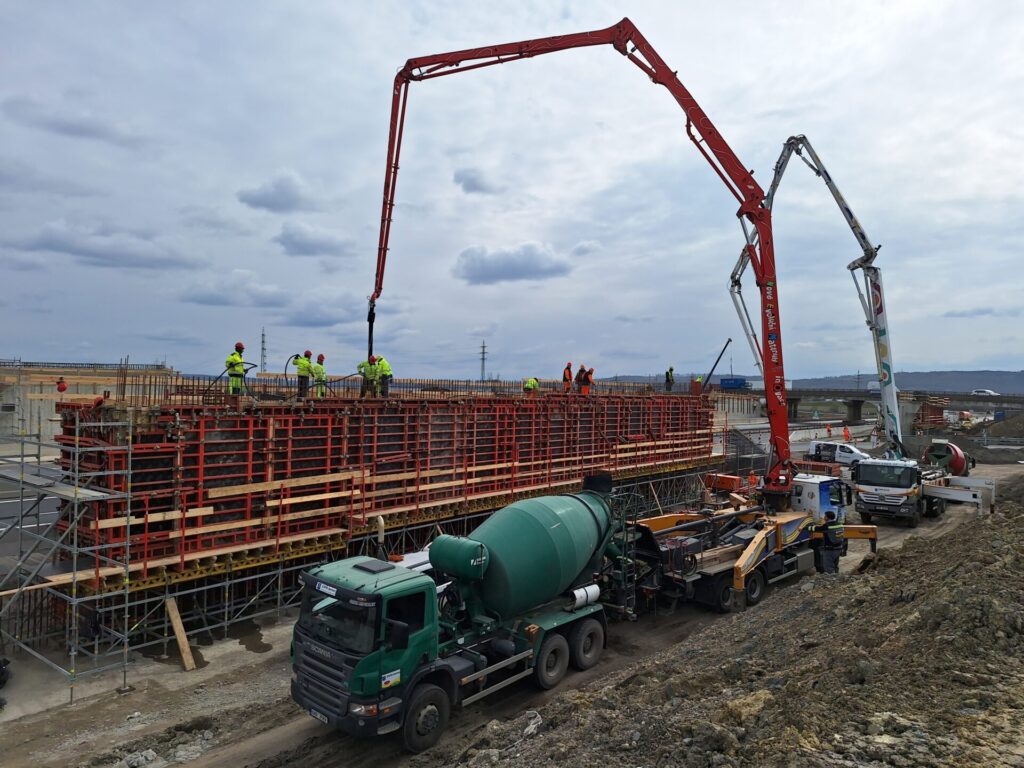 Součástí stavby jsou celkem 4 mostní opěry, dvě po každé straně dálnice, a právě byla dokončena betonáž poslední z nich. Užito k tomu bylo bezmála 500 kubíků betonové směsi, jejíž kvalita a hustota byla přímo na místě průběžně měřena tak, aby vyhovovala normě.